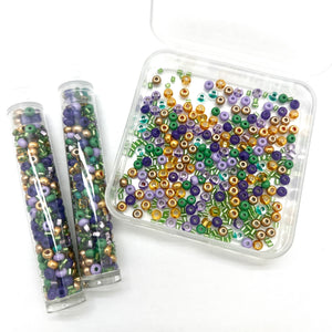 This year's mix includes a mix of purple, green and gold size 6 seed beads and metallic green 2mm bugle beads. Available in a 12 gram tube.