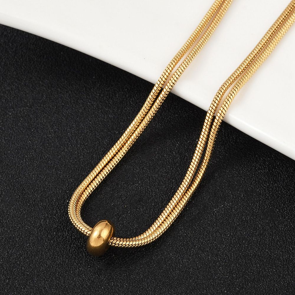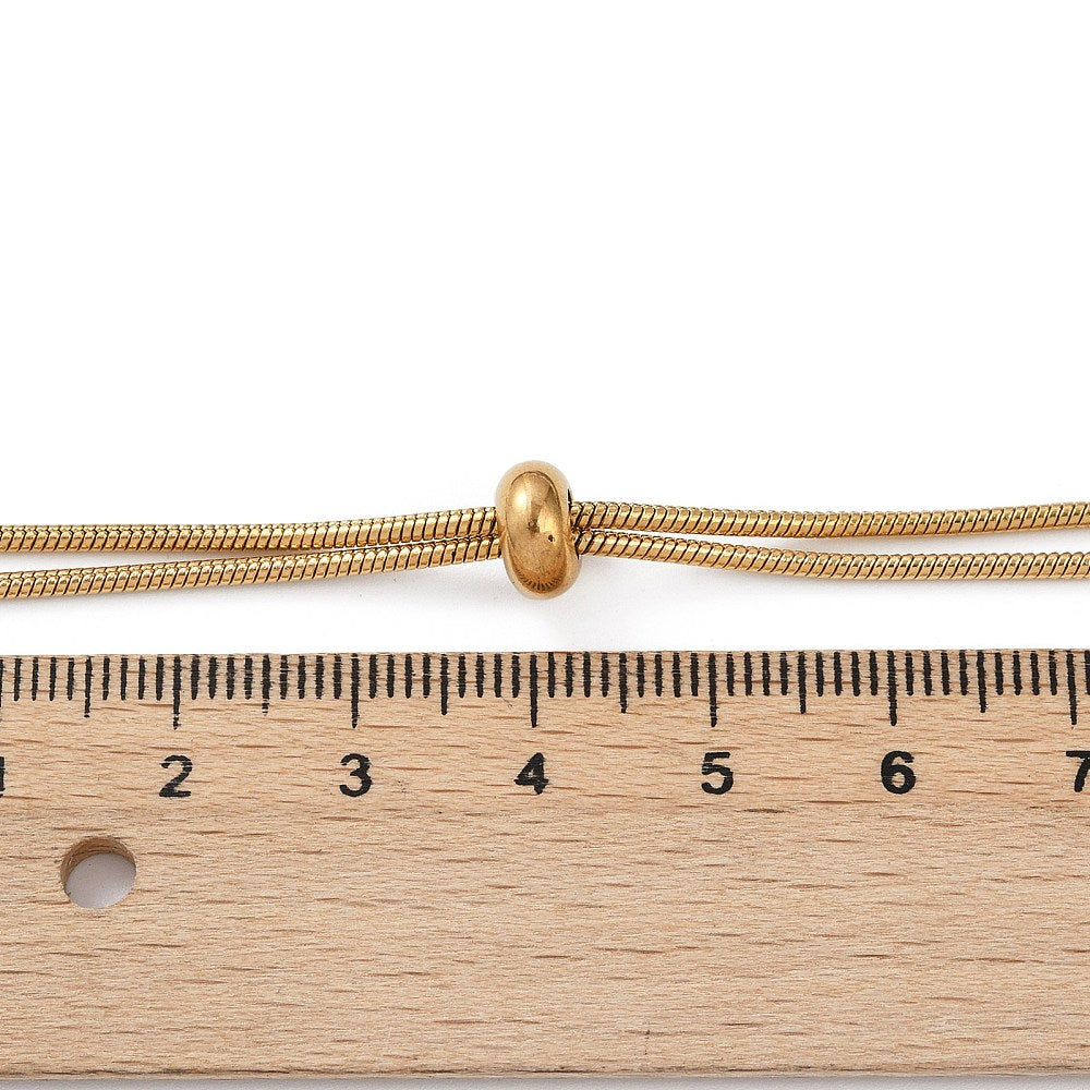 Plated stainless steel snake chain Bolo necklace with slider stopper bead, lobster claw clasp and jump rings. Perfect to wear as a lariat with your favorite connectors and fully adjustable up to 28".