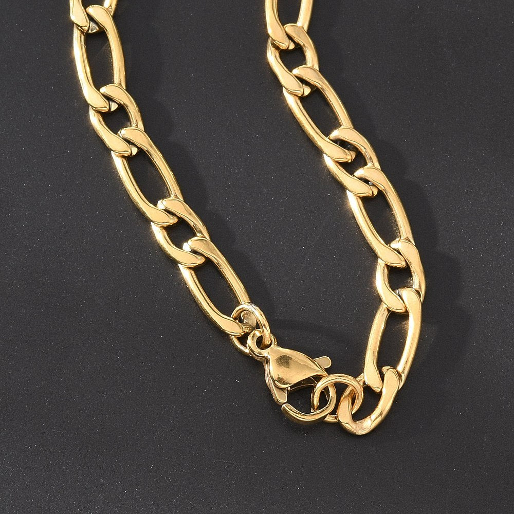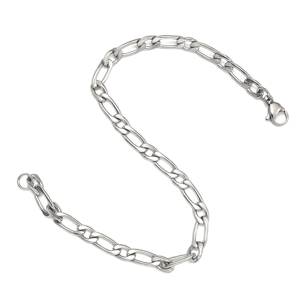 Plated stainless steel Figaro chain bracelet with a lobster claw clasp. Available in both stainless steel and gold plated stainless steel.