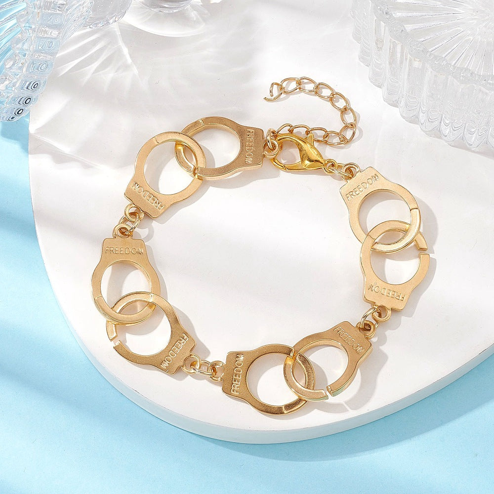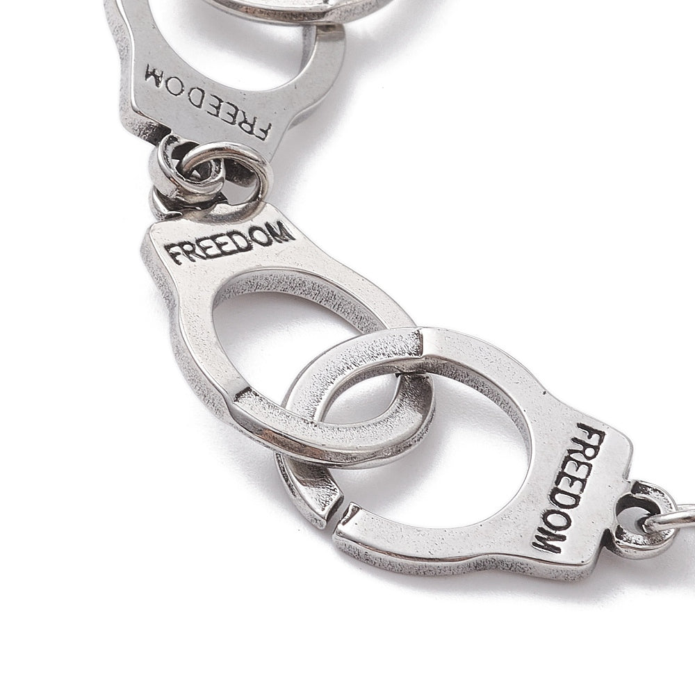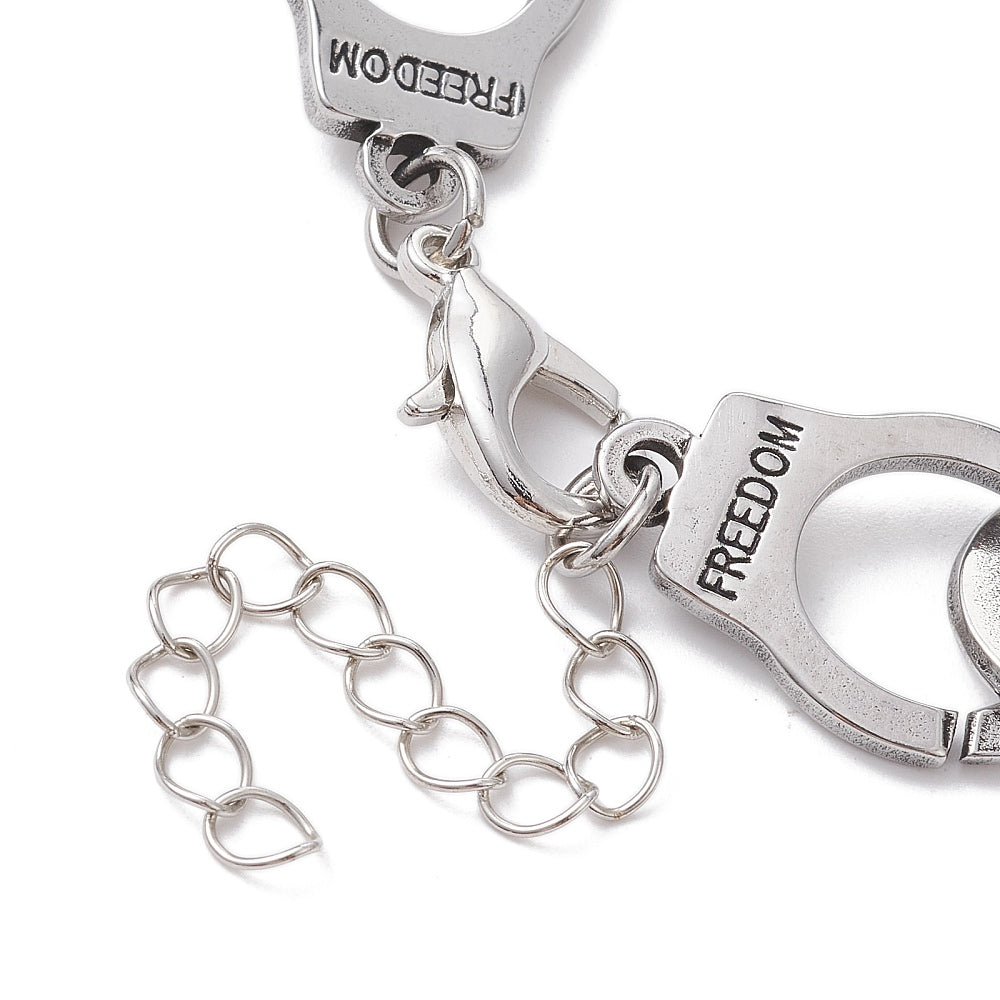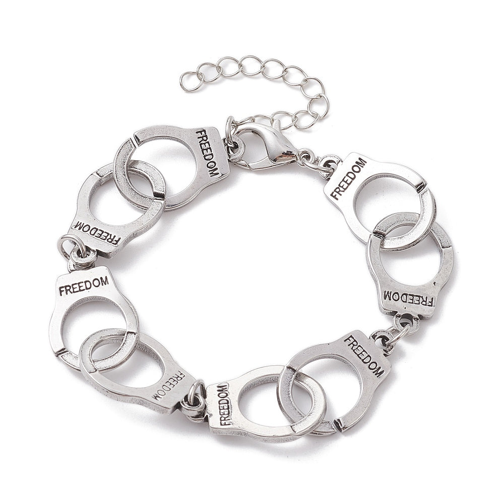 Plated alloy handcuff with "freedom" link chain bracelet with lobster claw clasp and extender chain.