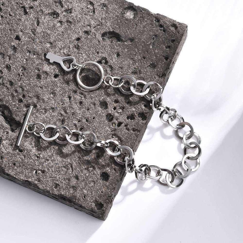 Plated stainless steel large cable chain bracelet with toggle clap with key charm.