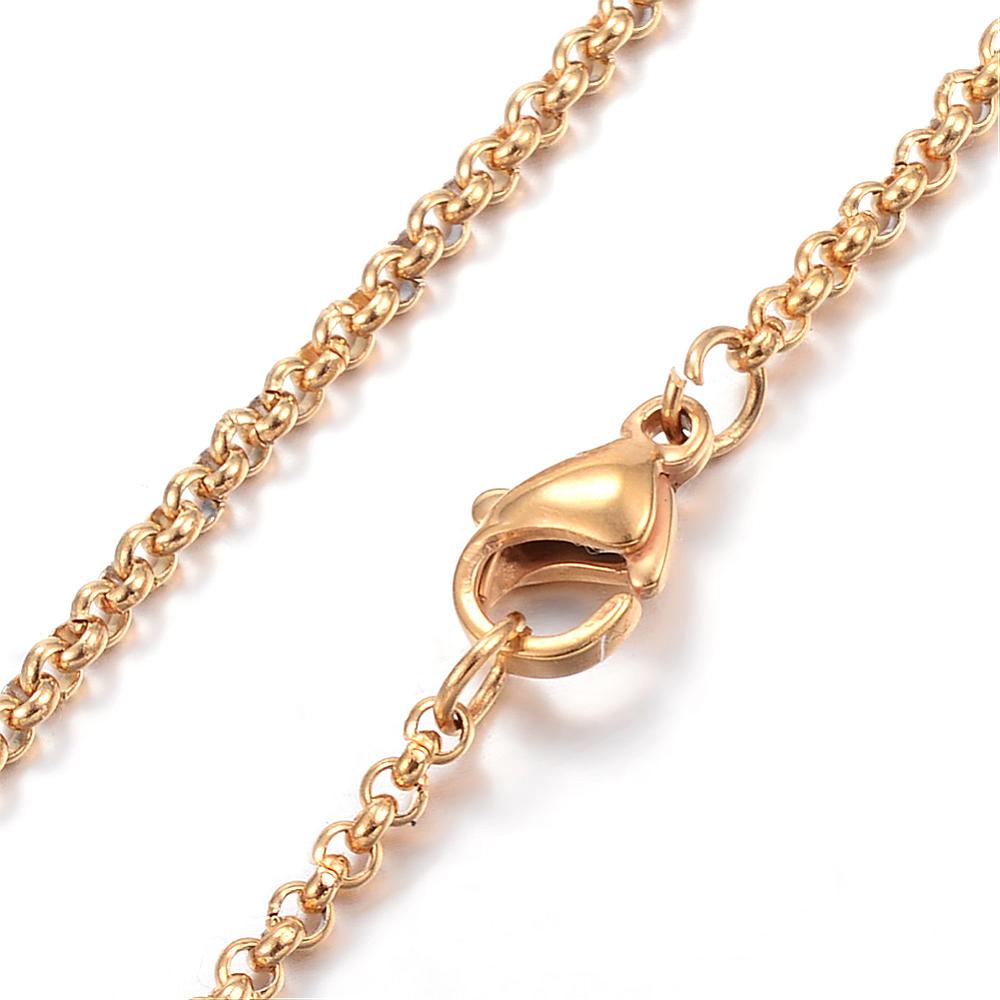 Gold plated stainless steel small Rolo chain necklace with lobster claw clasp. This style is super strong and made for daily wear and available in two sizes 17.75" (included extender chain) & 19.5".