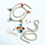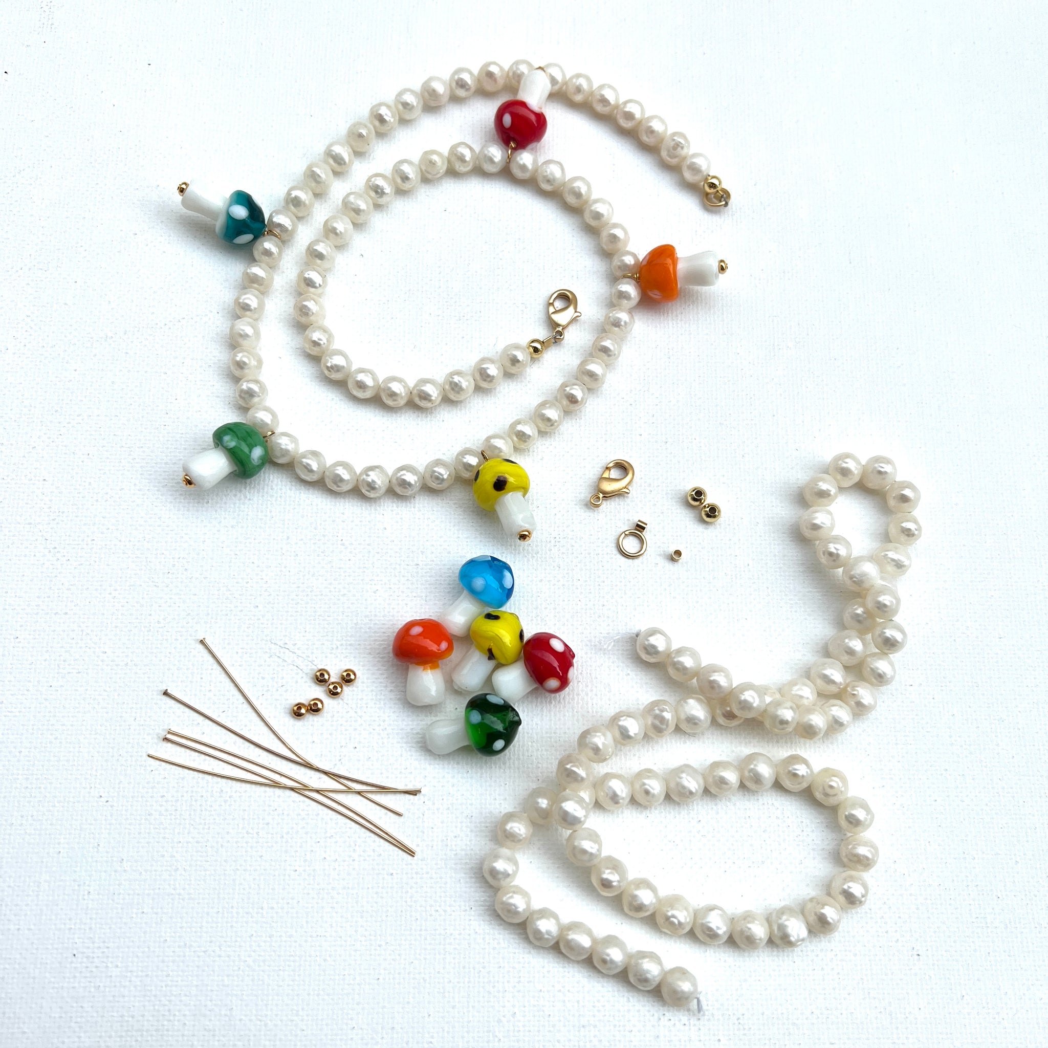 Kit includes a strand of REAL white faceted freshwater pearls, 5 glass mushrooms, beading wire, crimps, clasp, and headpins.
