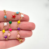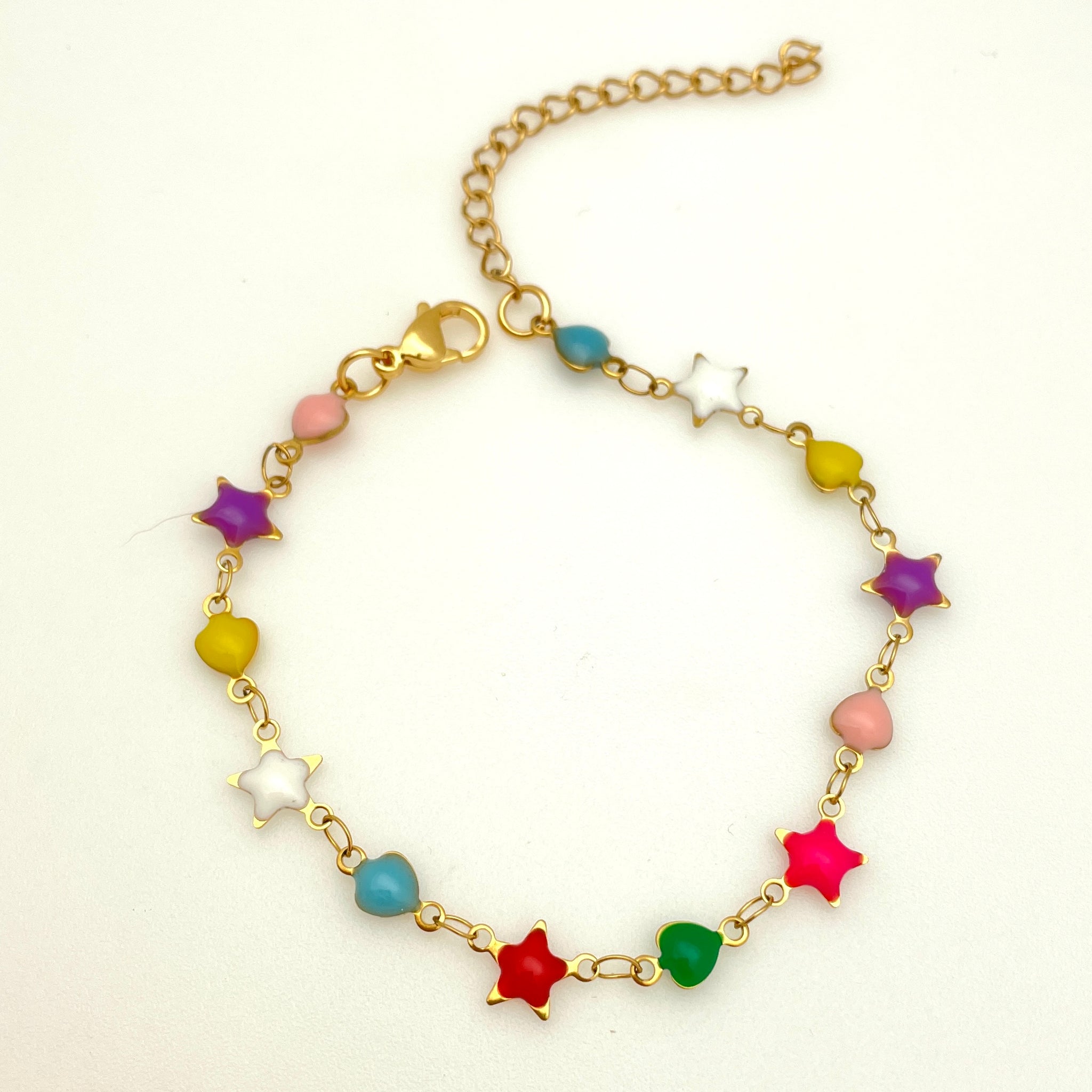 Plated stainless steel colorful enamel heart and star link chain bracelet with lobster claw clasp and extender chain.