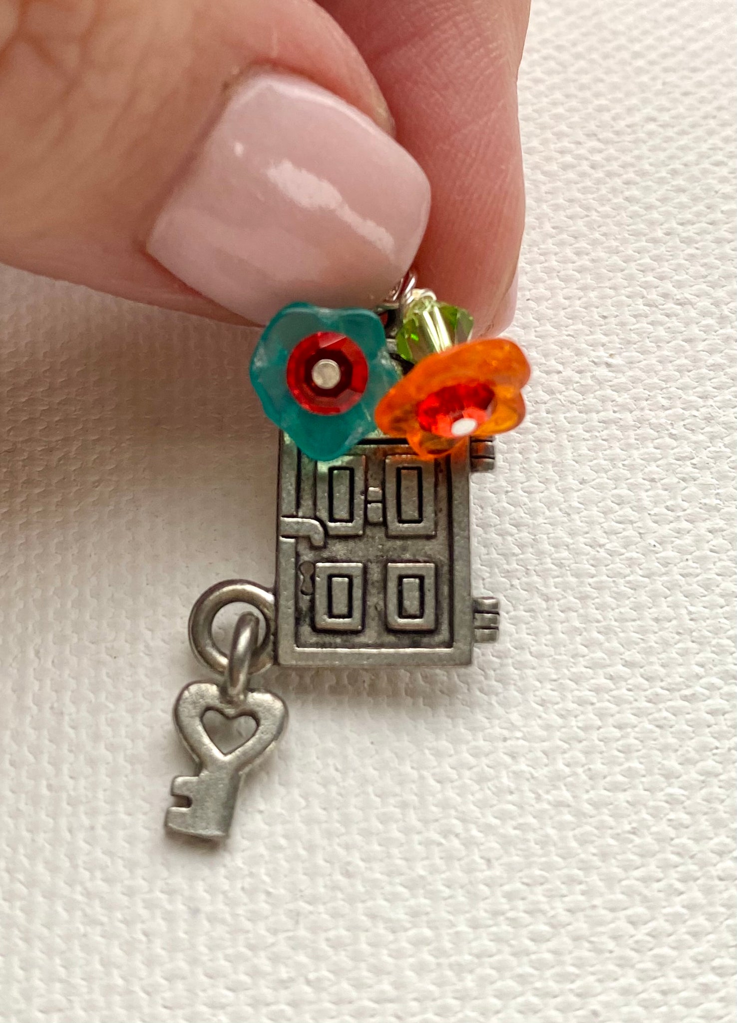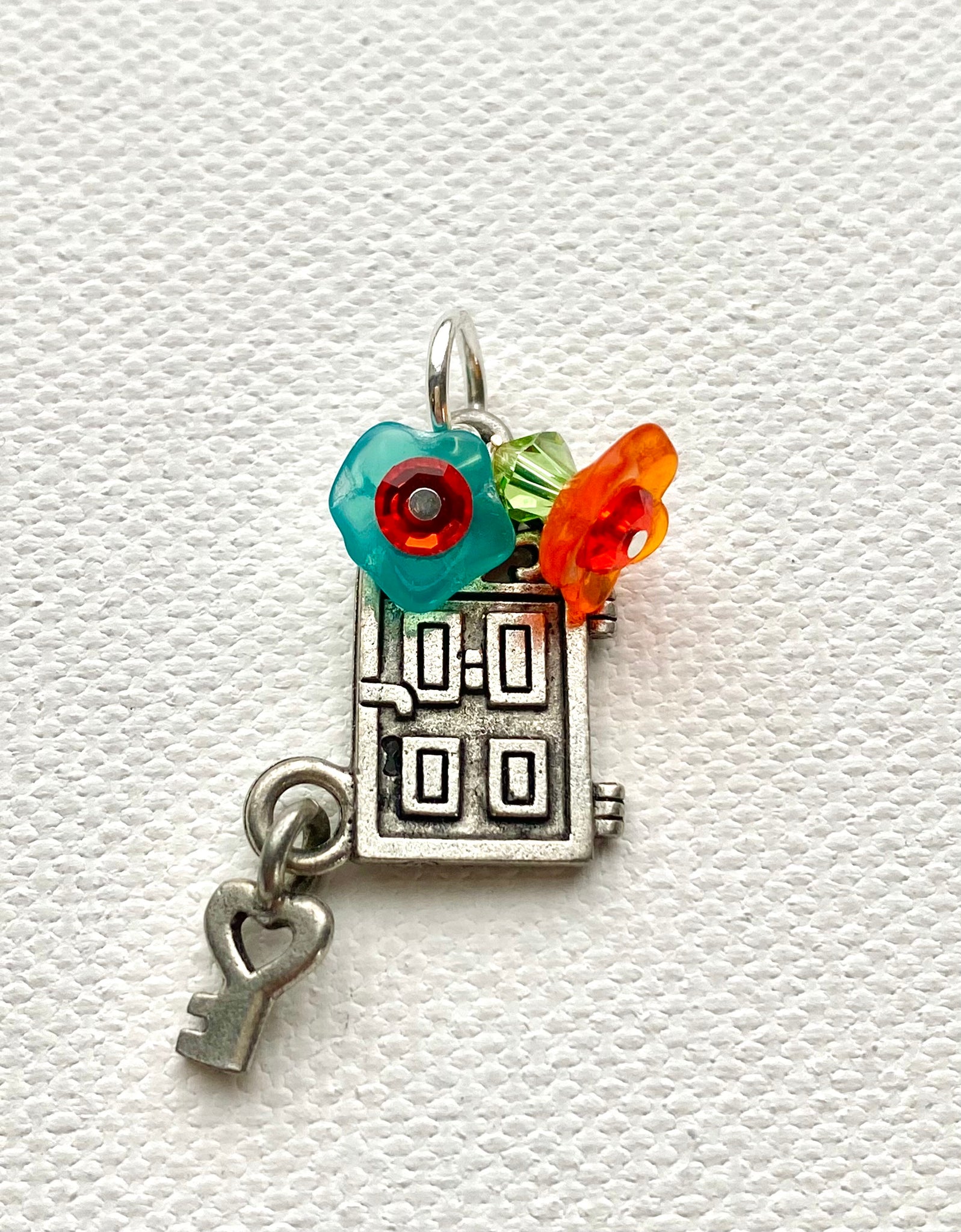 This double-sided pewter charm features glass flowers and Swarovski crystal. The charm is attached to a silver-plated jump ring, you can purchase it alone or buy it on a sterling chain!