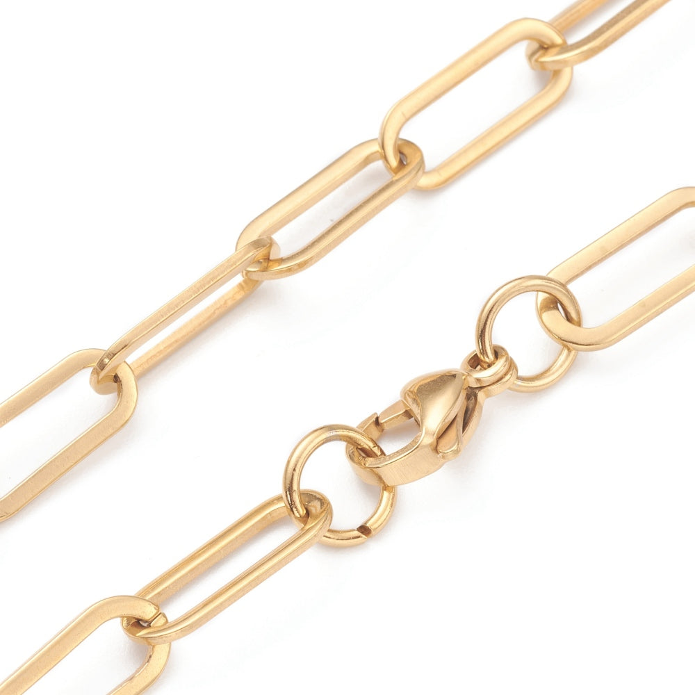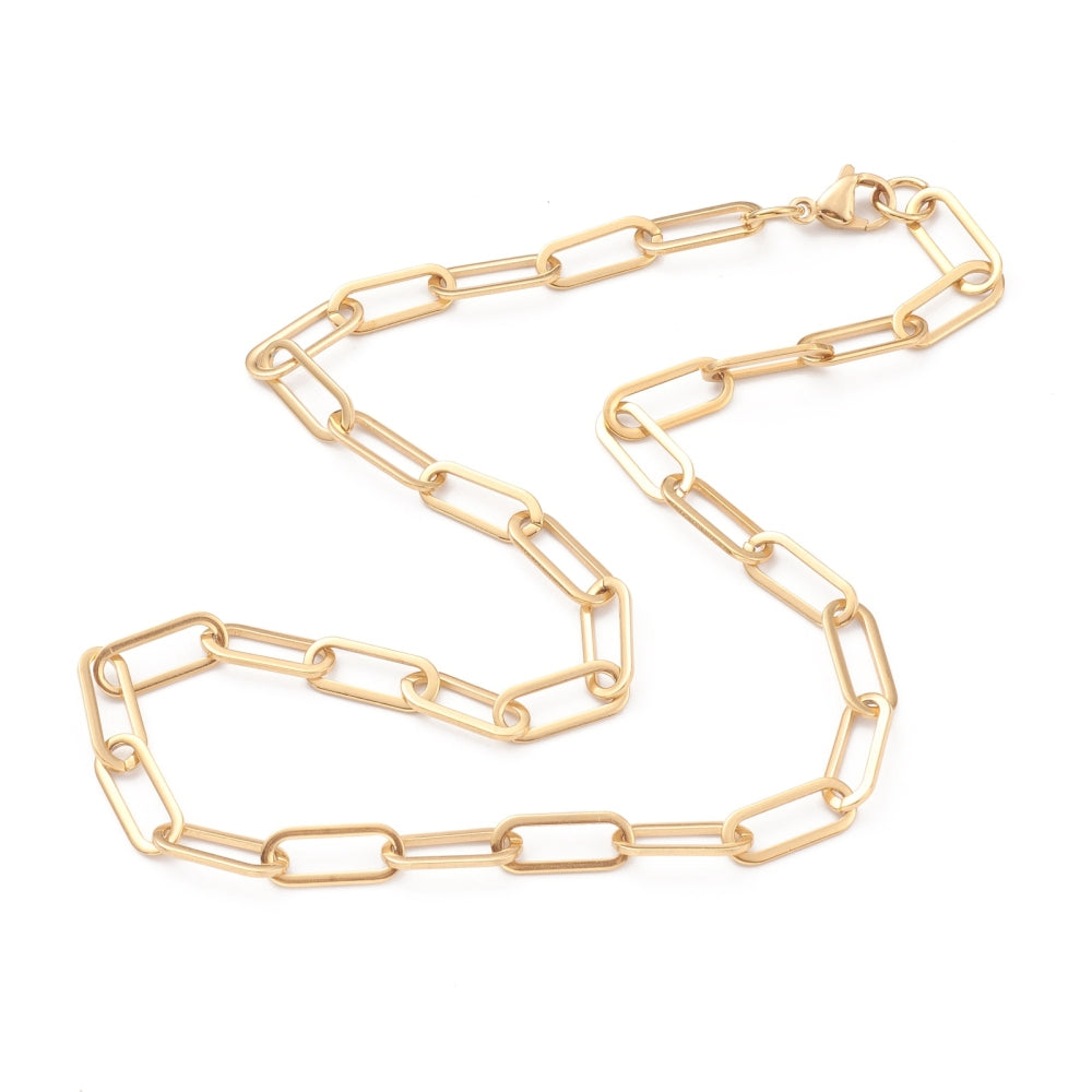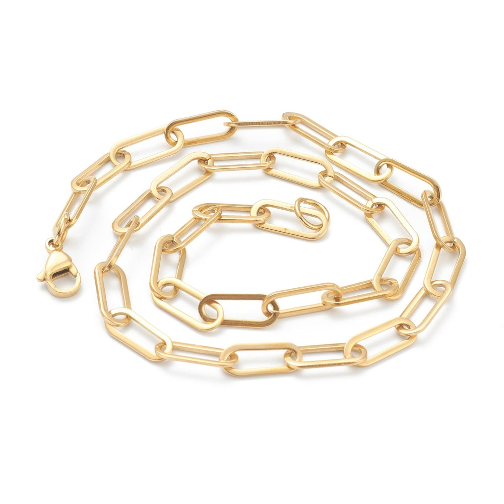 Gold plated stainless steel paperclip chain necklaces with lobster claw clasps measuring approximately 17.75" in length.