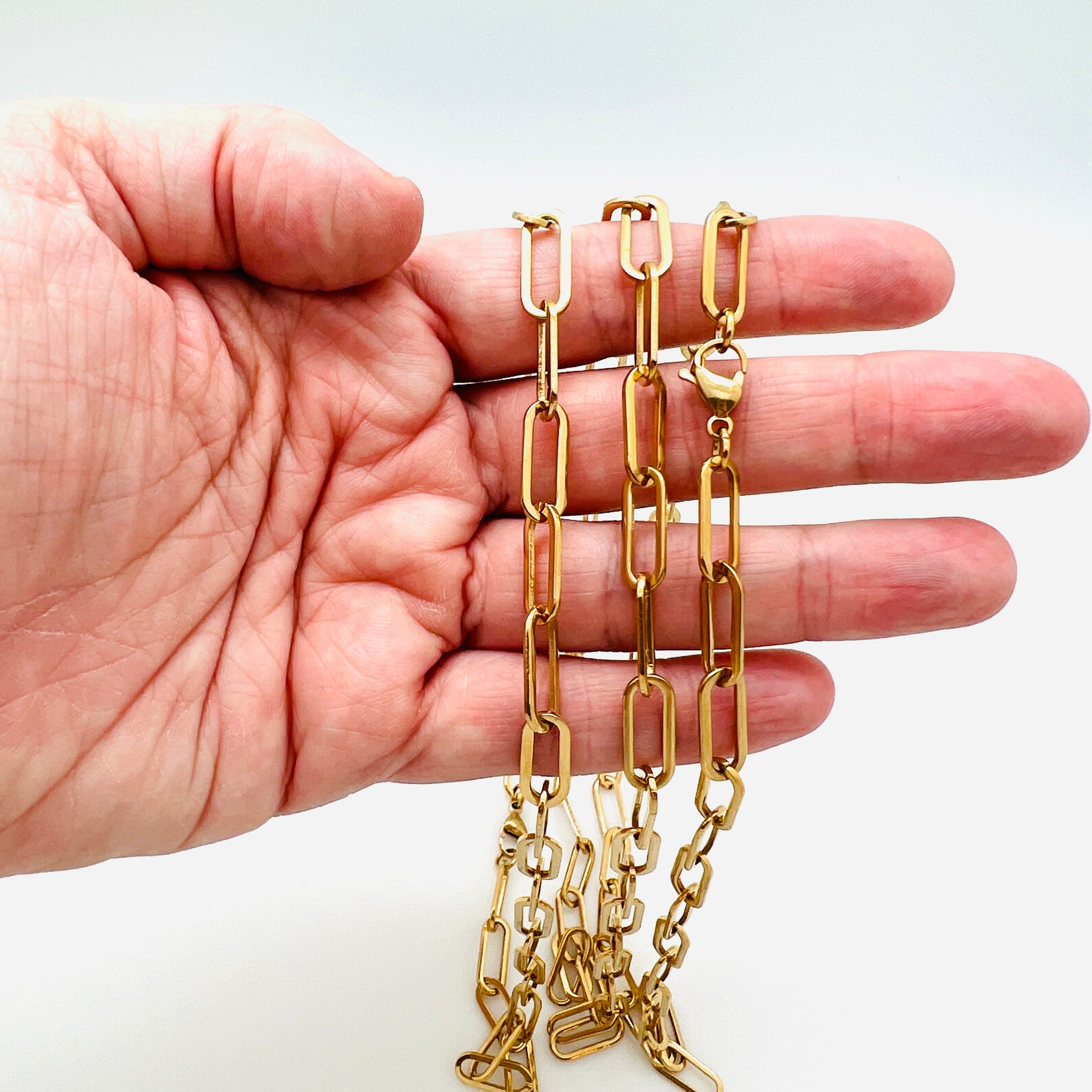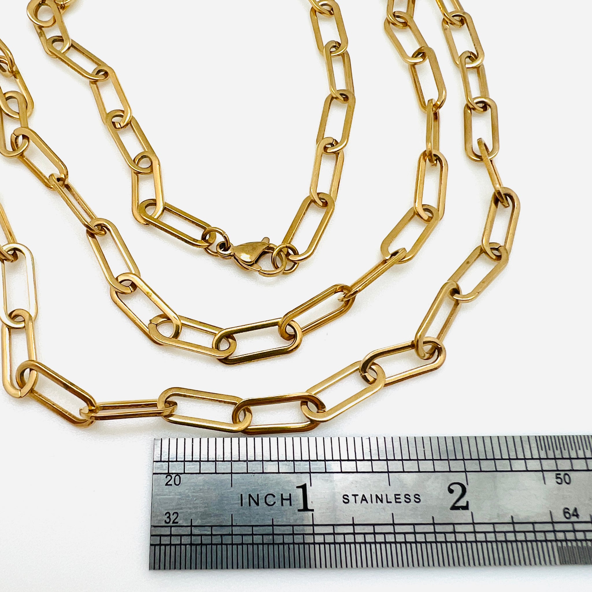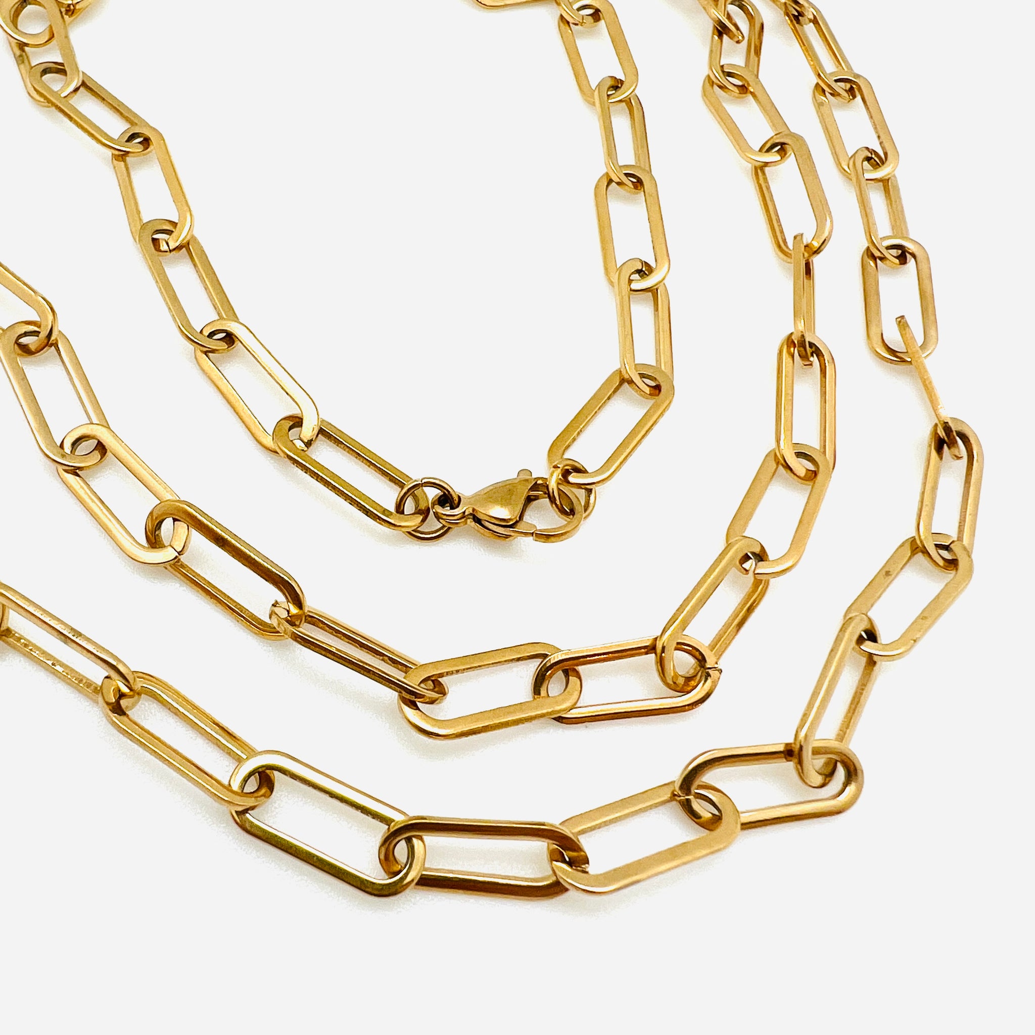 Gold plated stainless steel paperclip chain necklaces with lobster claw clasps measuring approximately 17.75" in length.