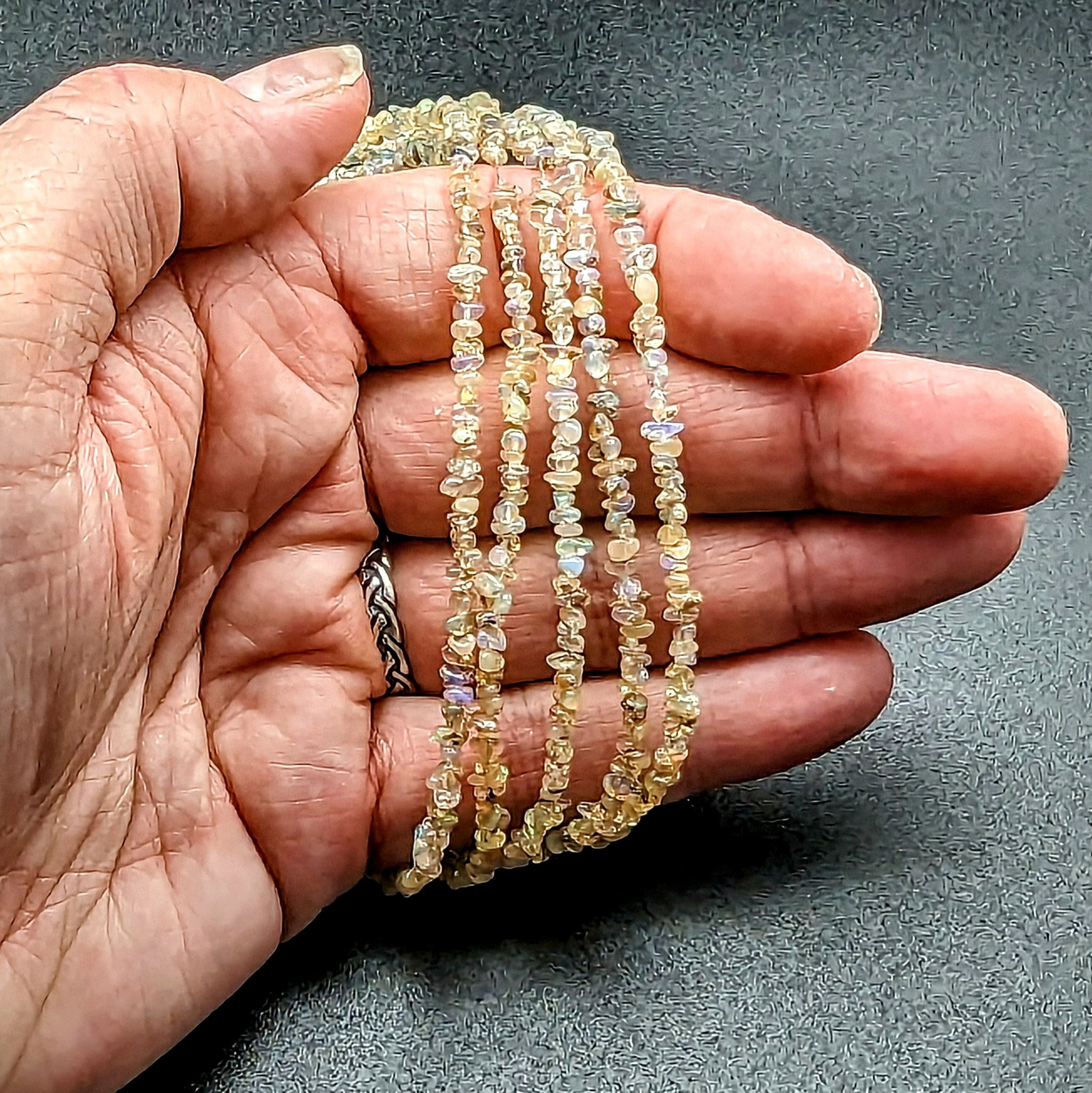 The 18" strand of Yellow Opal Chips contains approximately 14 beads per inch, ranging from 2mm-5mm.