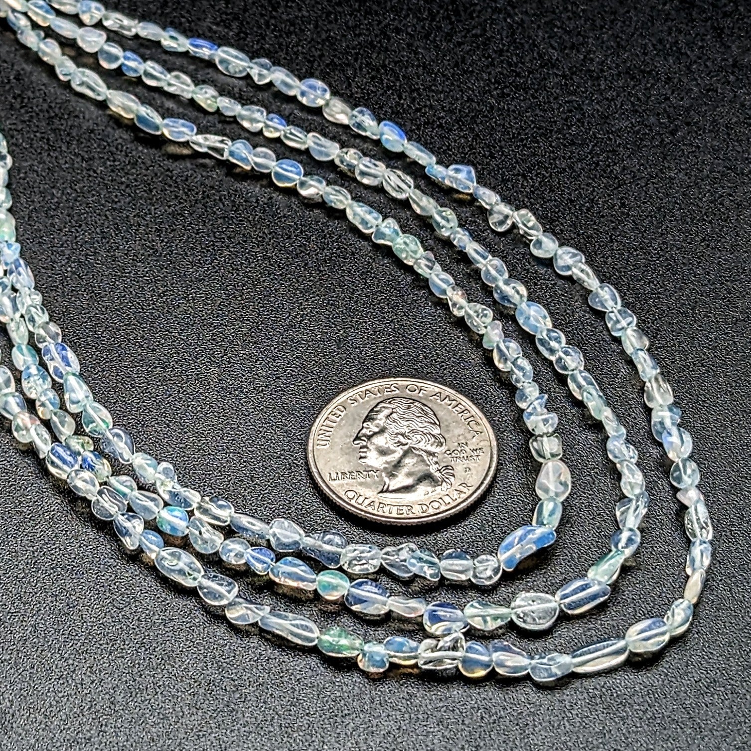 This 17" strand of fiery tumbled nugget Opals contains approximately 100 beads, measuring 3-7mm.