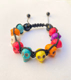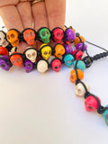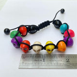 Multi-Color dyed stone skulls are tied with black nylon cord for a durable, adjustable macrame bracelet.