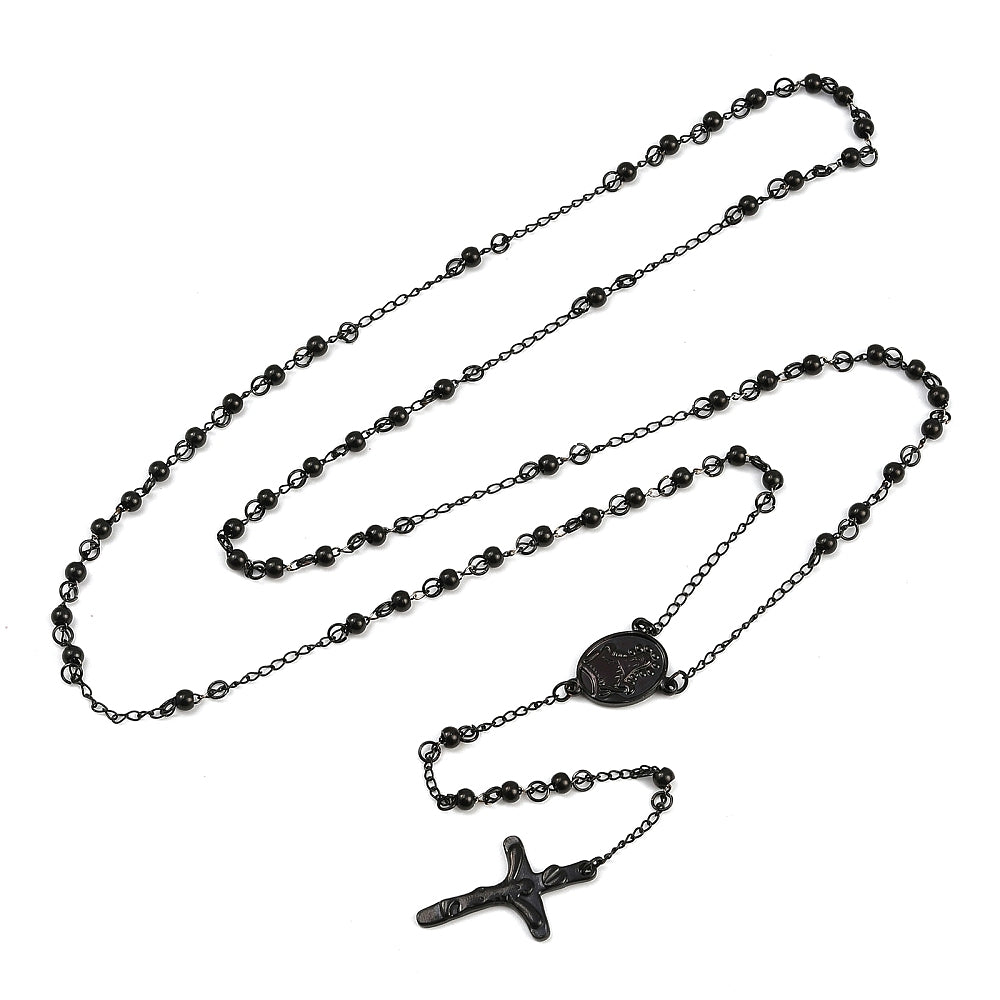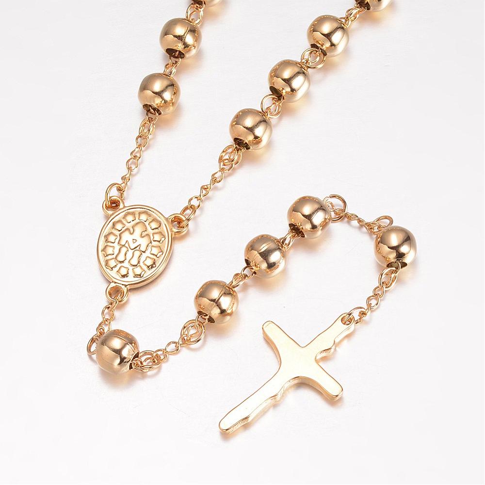 Plated stainless steel Rosary bead necklace with oval Virgin Mary connector link and cross pendant. Available with 6mm rosary beads in stainless steel and gold plated stainless steel or with 4mm rosary beads in gold plated stainless steel and black plated stainless steel.