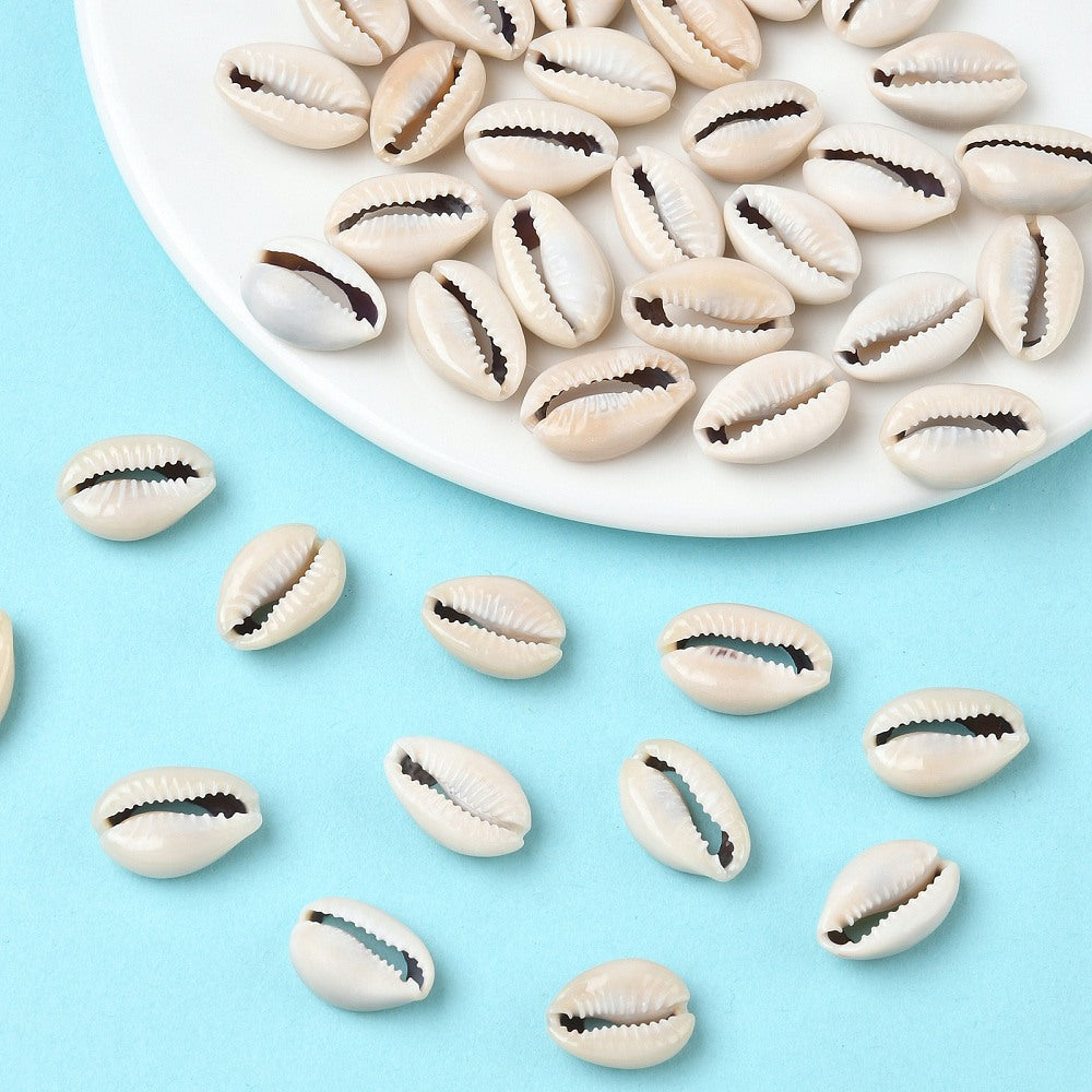 Natural cowrie shell beads, no paint or coating. No hole, but sliced open in the back. 50 pcs per bag.