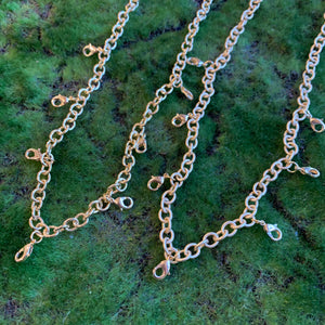 20" adjustable necklaces with spots for 5 of your collectible Mardi Gras Ball pins. (Or any pins or charms!) We can add more hanging spots at your request. The product for purchase is the chain only, the photos shown with pins are examples of how the product is used.