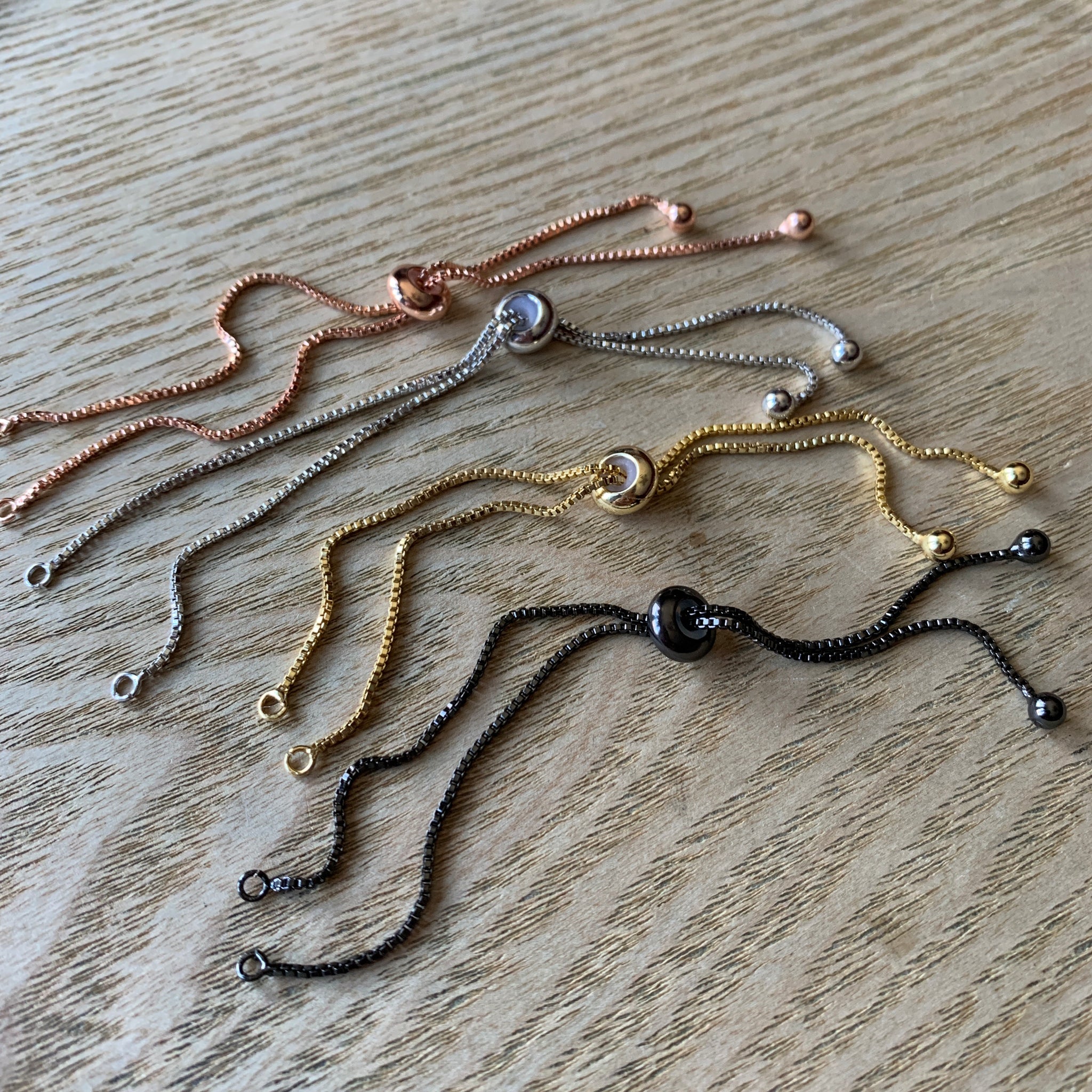 Plated stainless steel adjustable slider box chain necklace and bracelets with slider beads, two jump rings and two bezel set clear stone stopper beads. These chains are so much fun!