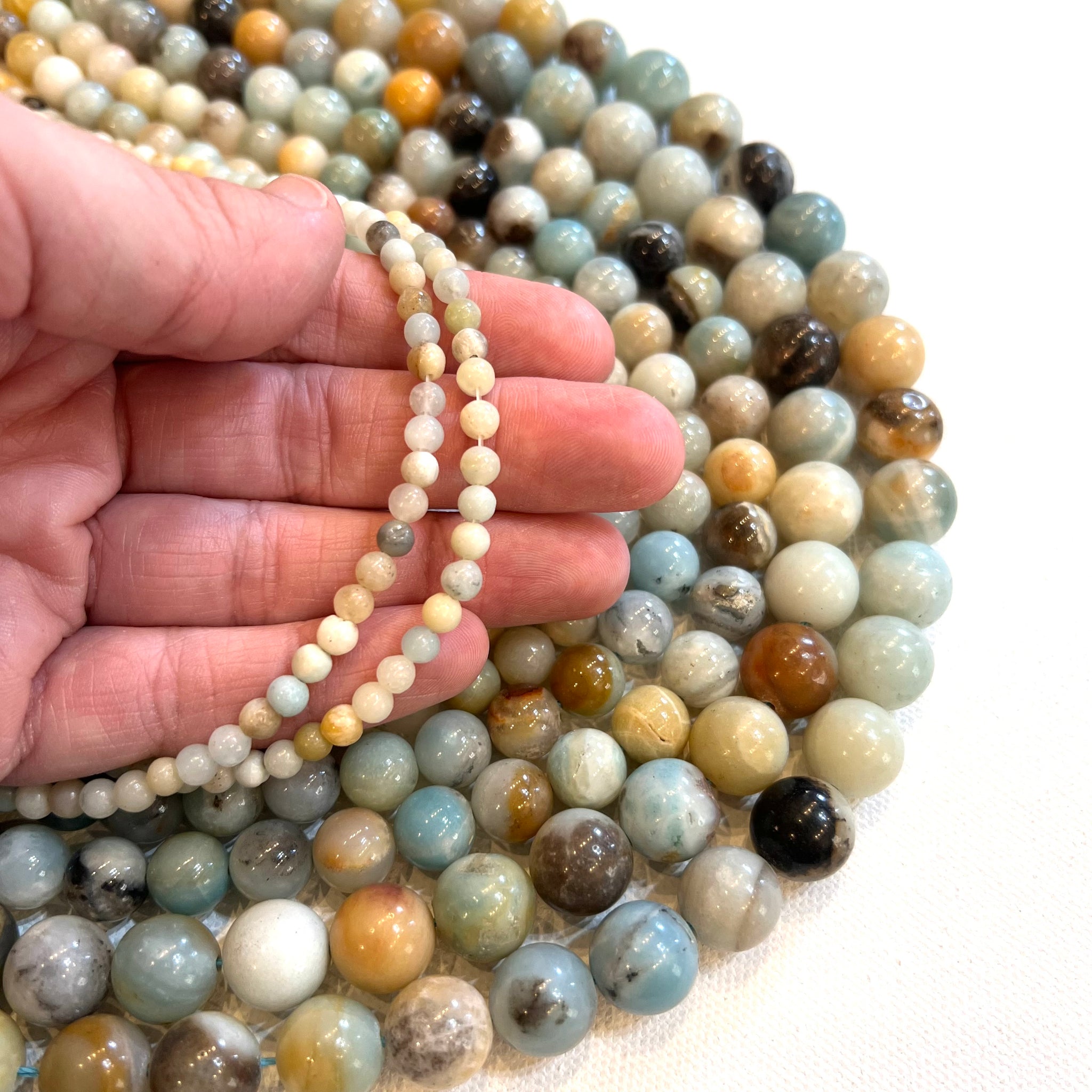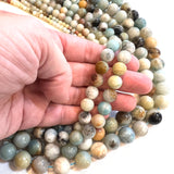 Natural Amazonite beads in shades of tans, black and a small amount of blue