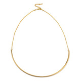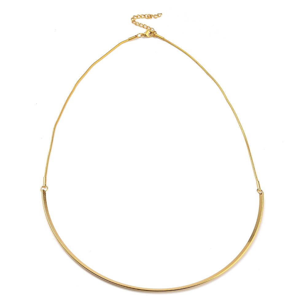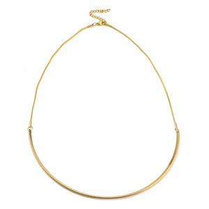 Gold plated stainless steel curved bar necklace with round snake chain, lobster claw clasp and extender chain.