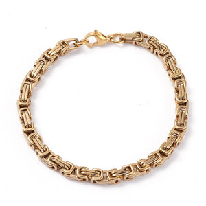 Plated stainless steel Byzantine chain bracelet with lobster claw clasp. Available in both stainless steel and gold plated stainless steel, this classic look is a must have!