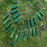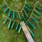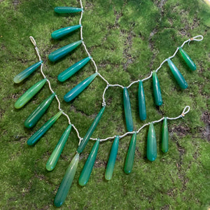 Dyed green chalcedony long drops measuring from approximately 7x32mm to 9x48mm