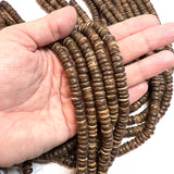 Natural coconut shell cut into 8x4mm heishi shaped beads.