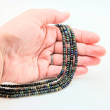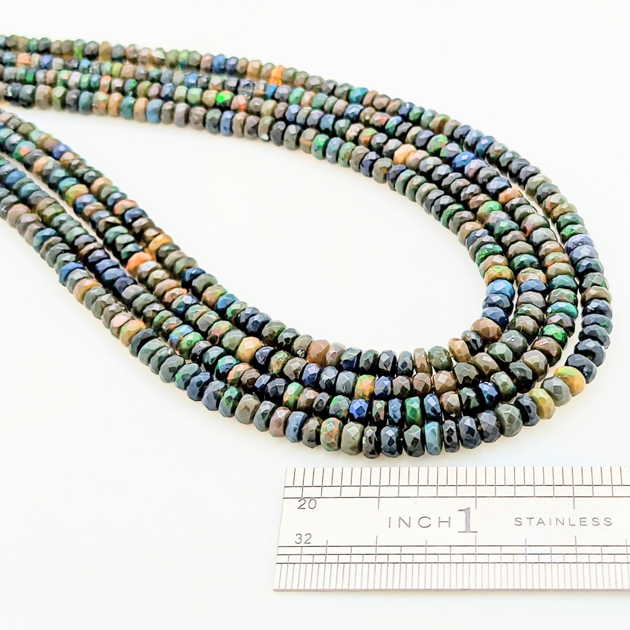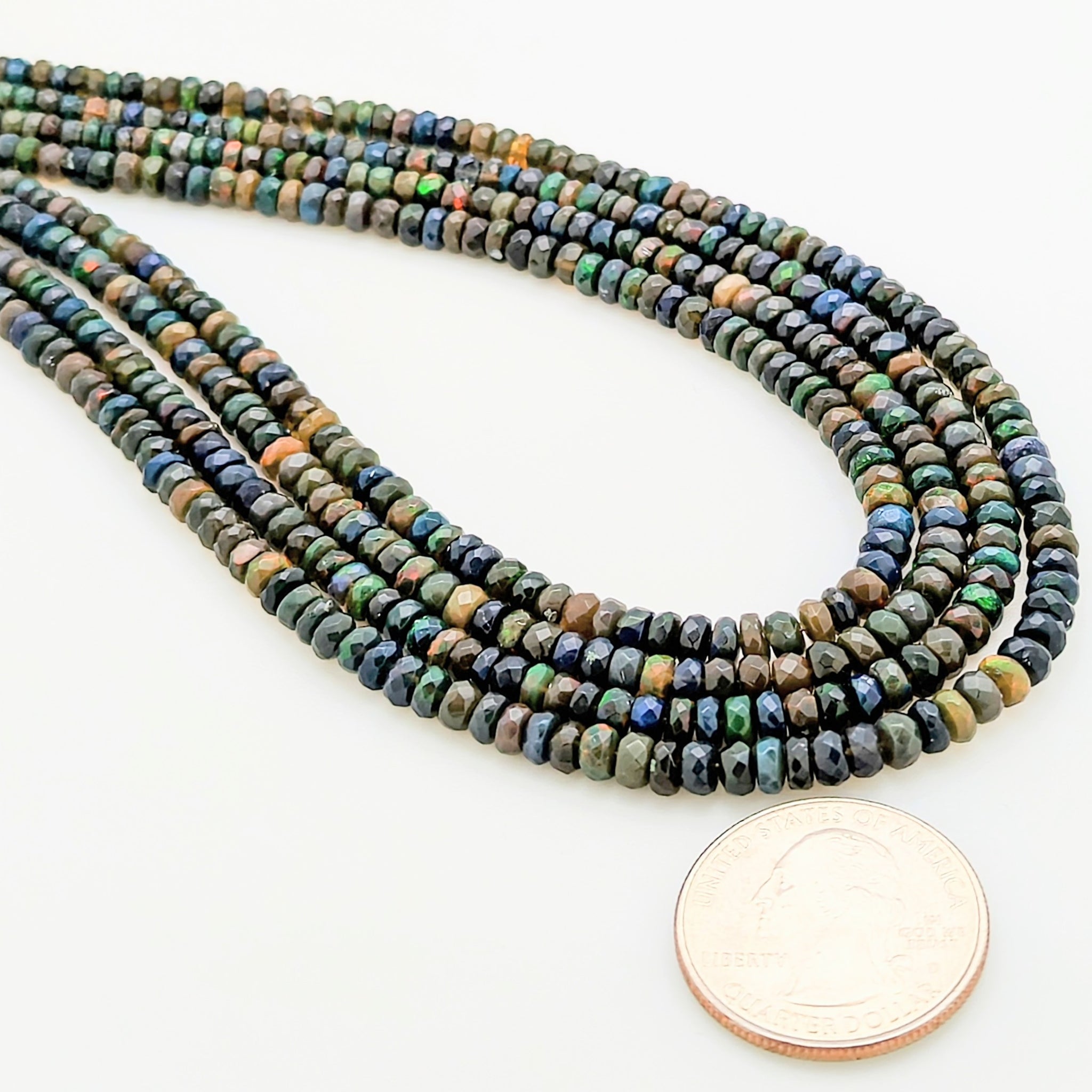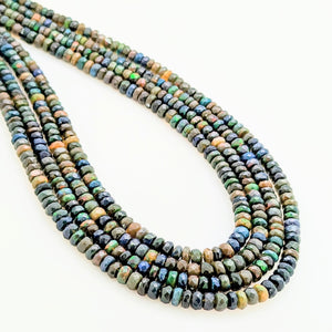This 17" graduated strand of faceted Ethiopian Black Opal contains approximately 192 beads, graduating from 4mm-6mm.