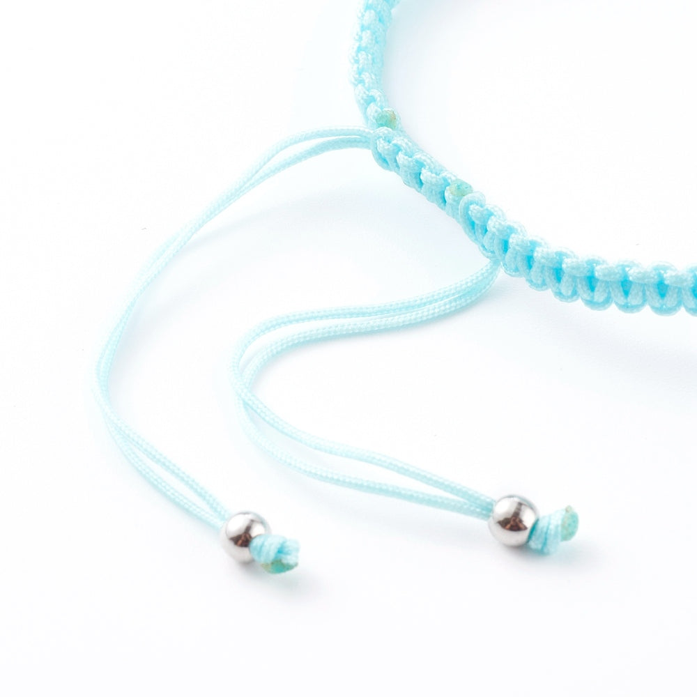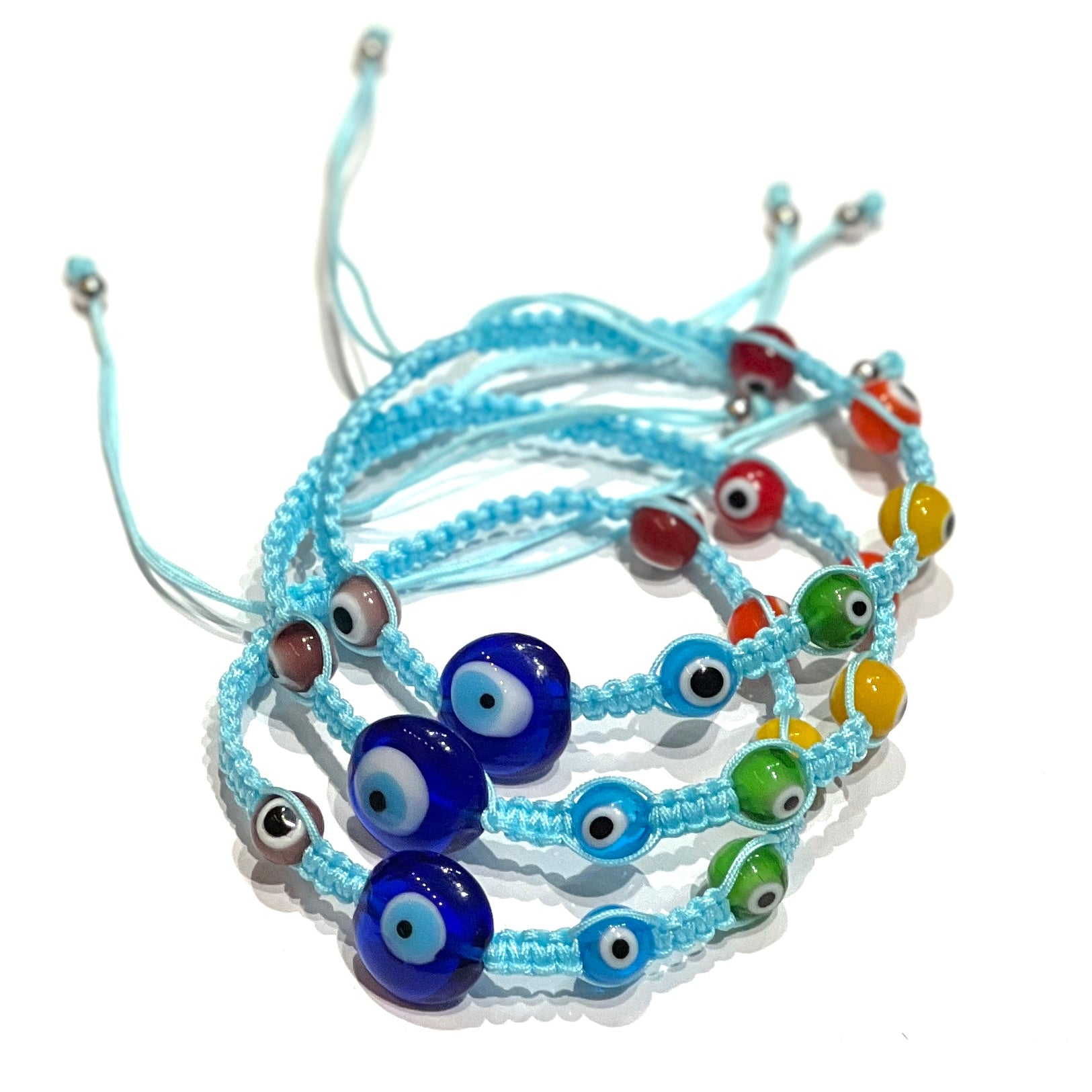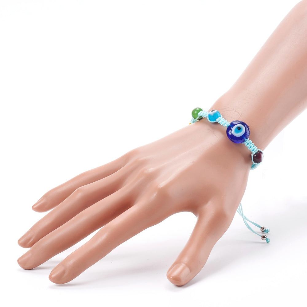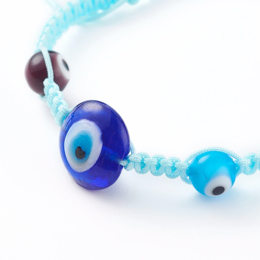 Light blue adjustable macrame nylon cord bracelet with chakra colored lampwork Evil Eye beads.