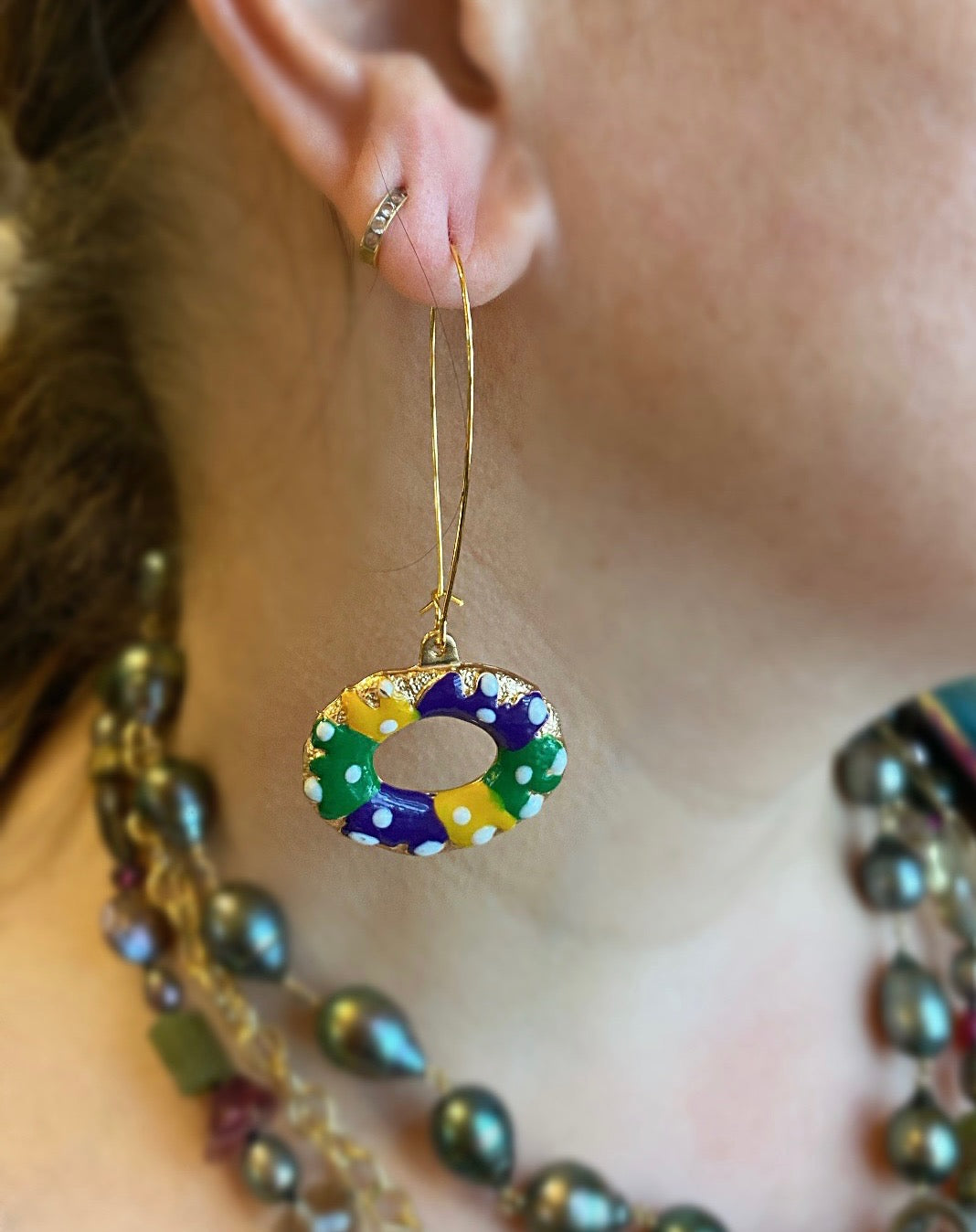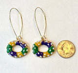 Bright enamel king cake earrings on long kidney shaped earwires!