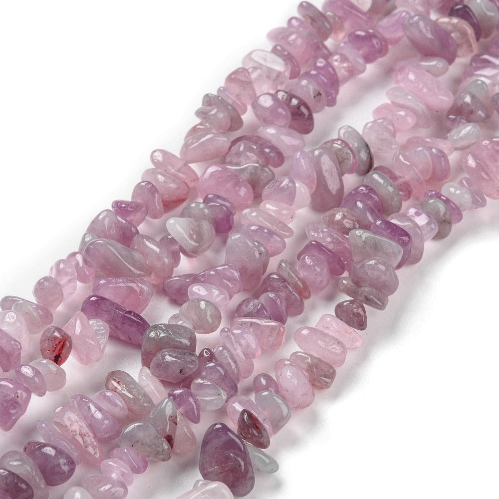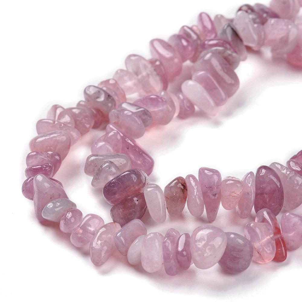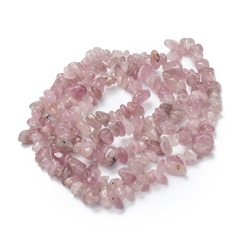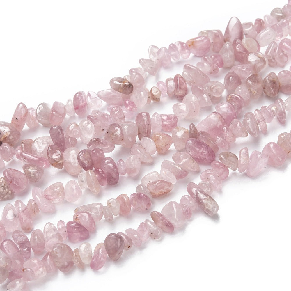 Natural Madagascar rose quartz chip strand. Available in a softer, light pink variety, as well as some deeper, dark pink varieties.