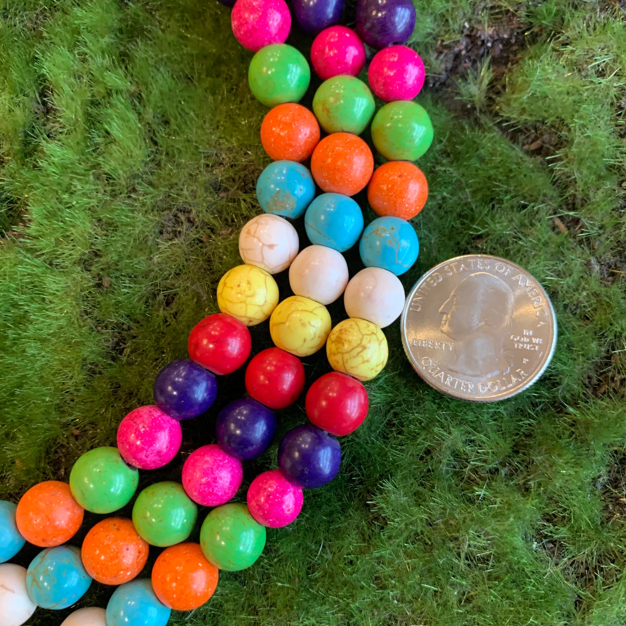 Dyed magnasite round beads in an assortment of sizes.