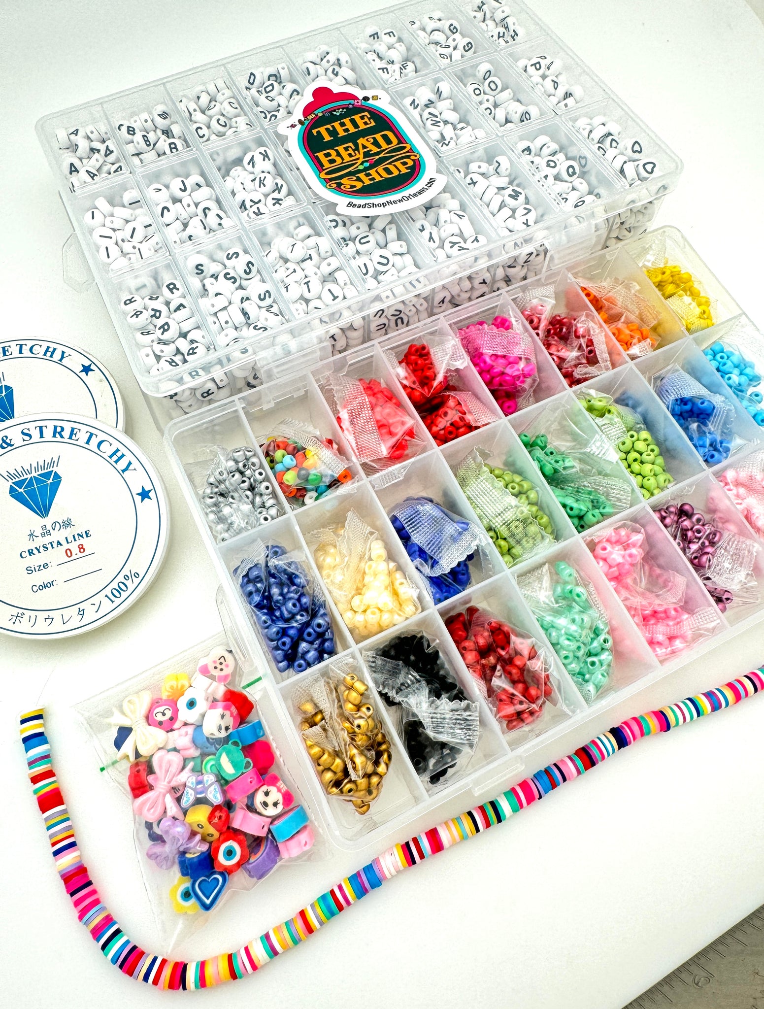 Stand out with this colorful kit which includes alphabets beads (including hearts!), seed beads in 24 colors, bright polymer clay discs, and for accents, iridescent bows and a selection of unique polymer clay beads. Two spools of clear elastic cord are included (makes approximately 40 bracelets).