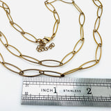 Gold plated stainless steel marquise paperclip chain necklace with lobster claw clasp and extender. This necklace measures about 20.5" in length with an approx. 2" extender.