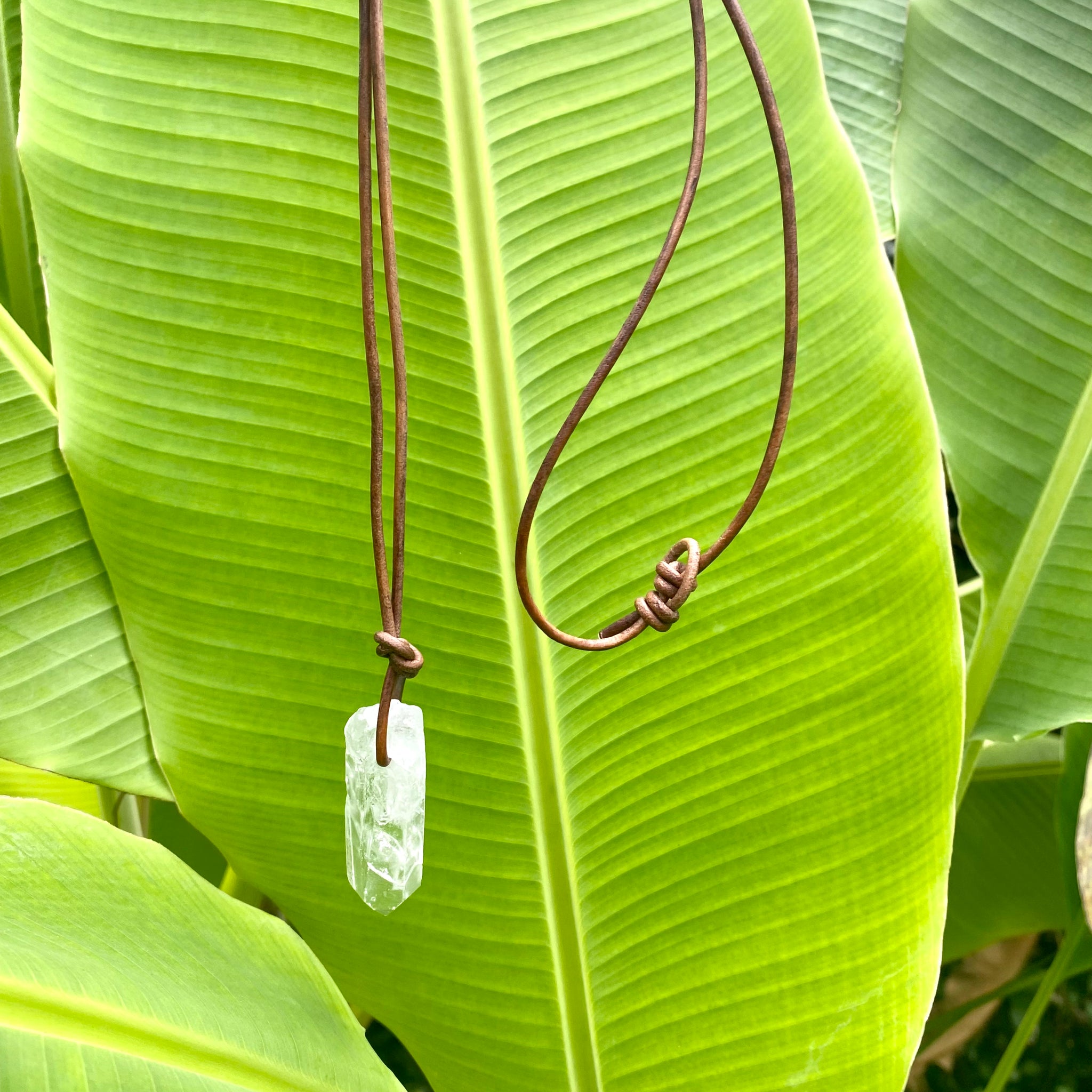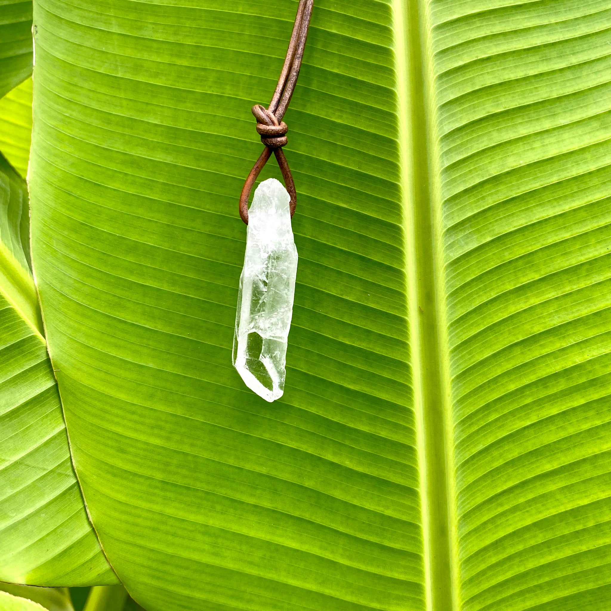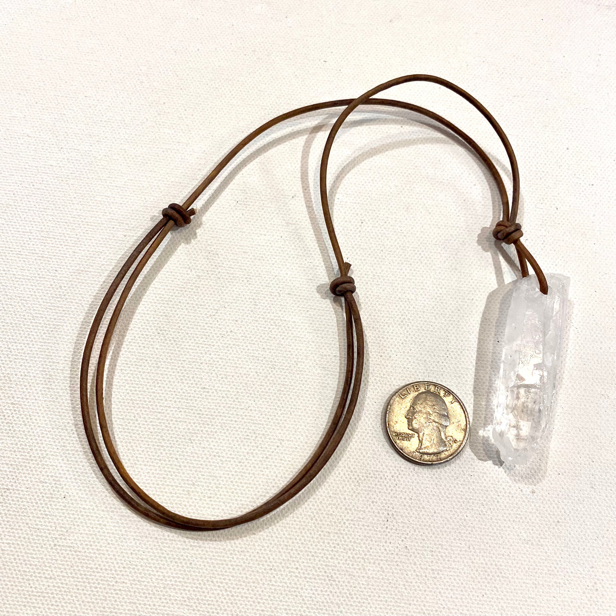 2-inch clear quartz point hung on a brown leather cord. Made with an adjustable knot, appx 15 inches full length.
