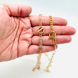Mixed chain necklaces are in! These gold plated brass chain necklaces measuring about 17" in length feature a toggle clasp and are available in either cob leaf and paperclip or curb chain and paperclip combinations.