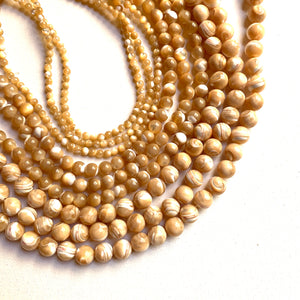 Natural color mother of pearl round beads in 4, 6, 7, and 10mm sizes