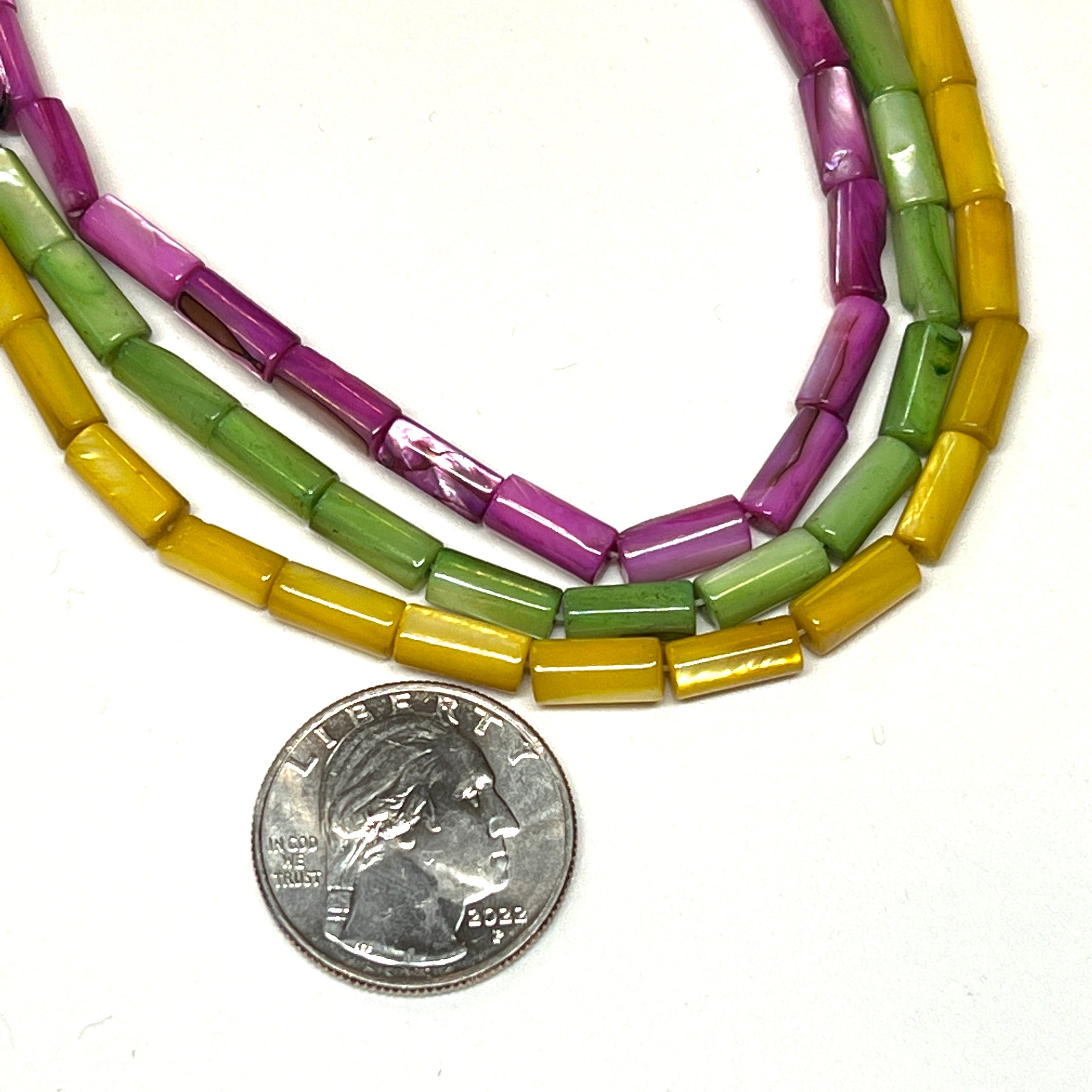 Dyed Purple, Green, and Gold mother of pearl tube beads. We know what we'll use them for (hint: it's Mardi Gras..) but you can get creative and use these great beads for anything your heart desires!