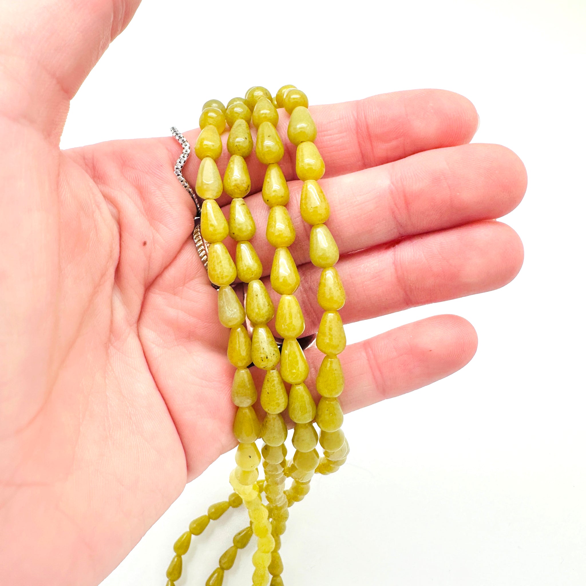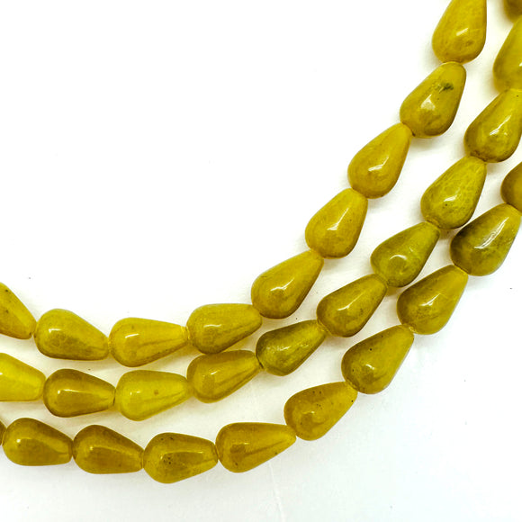 Strand of Olive Jade in teardrop shape. Strand is 15.5" long and has 43 beads.