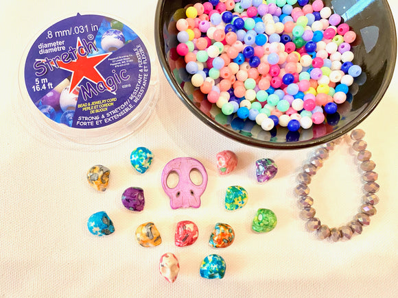 Includes a spool of stretchy cord and instructions to successfully tie your bracelets.