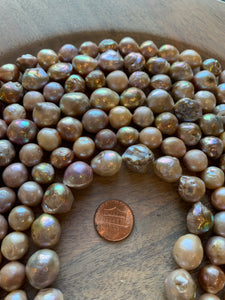 Beautifully textured peach champagne freshwater pearl strands. Each strand is 16" long and contains 26-33 11mm-13mm pearls.