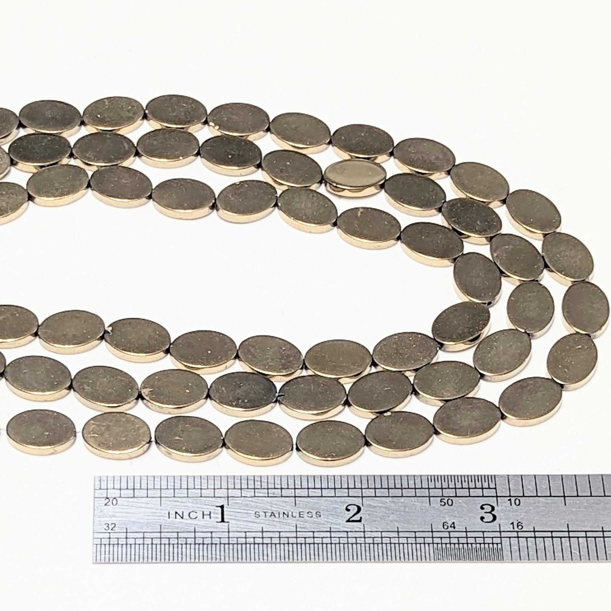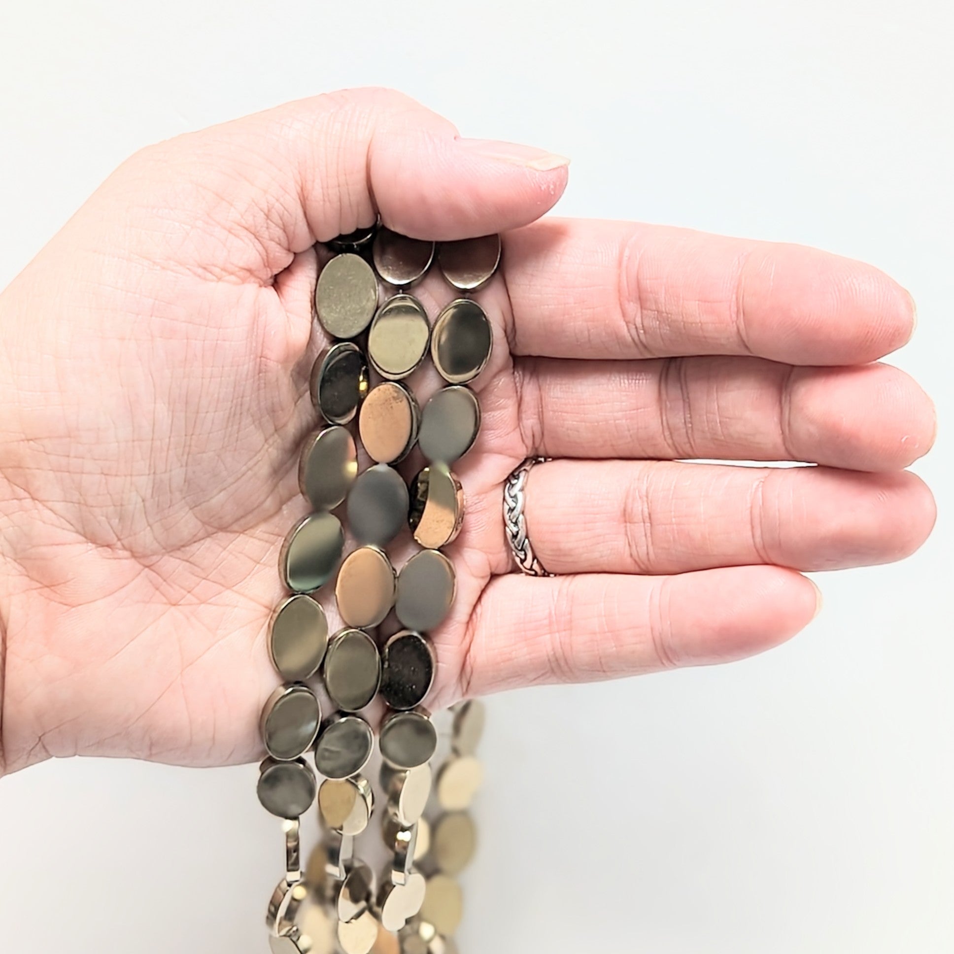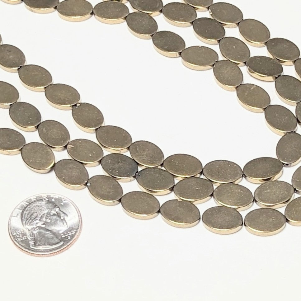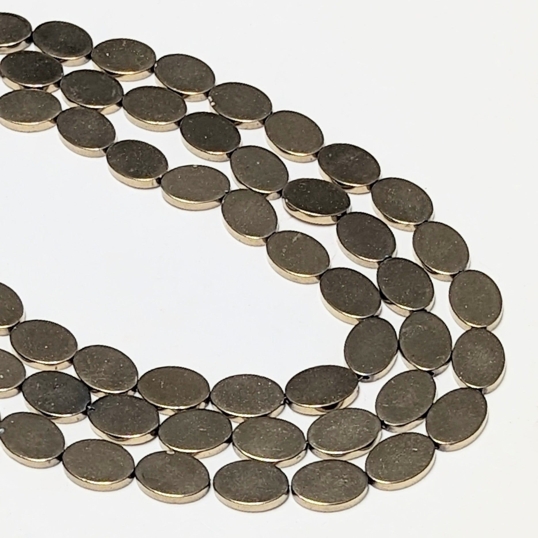 This 15" strand of electroplated Hematite flat oval beads contains approximately 30 beads. Each bead measure 13x10x2mm.