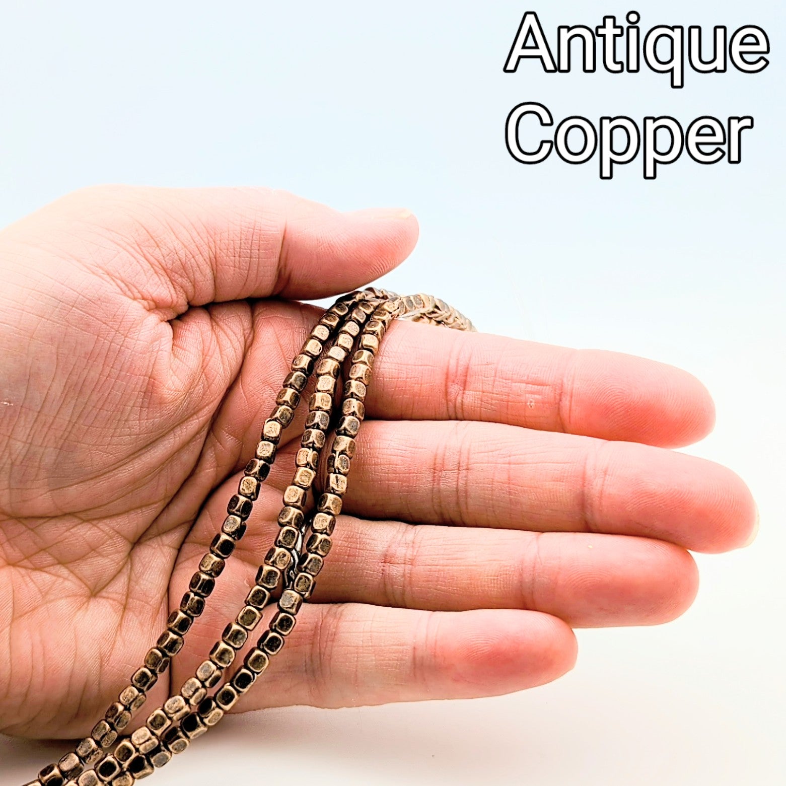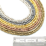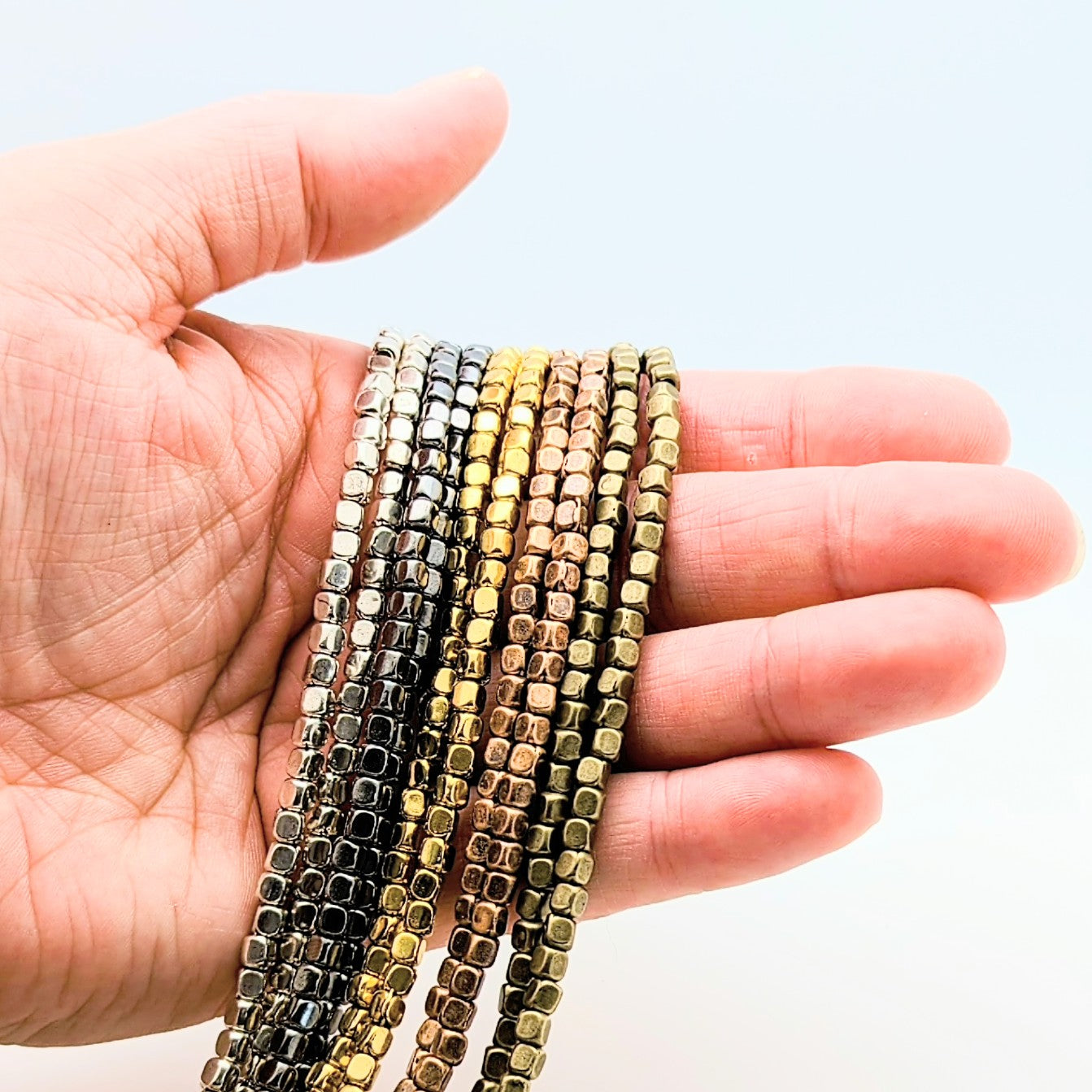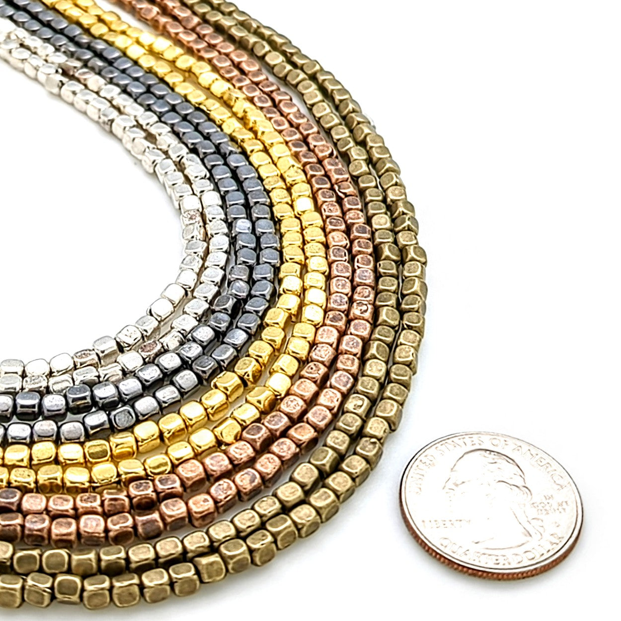 Each 14.5" strand of plated pewter soft cube beads comes in 5 different colors: Silver, Gunmetal, Gold, Antique Copper and Antique Brass. Each strand contains approximately 7 beads per inch, each measuring 3 x 4 mm.