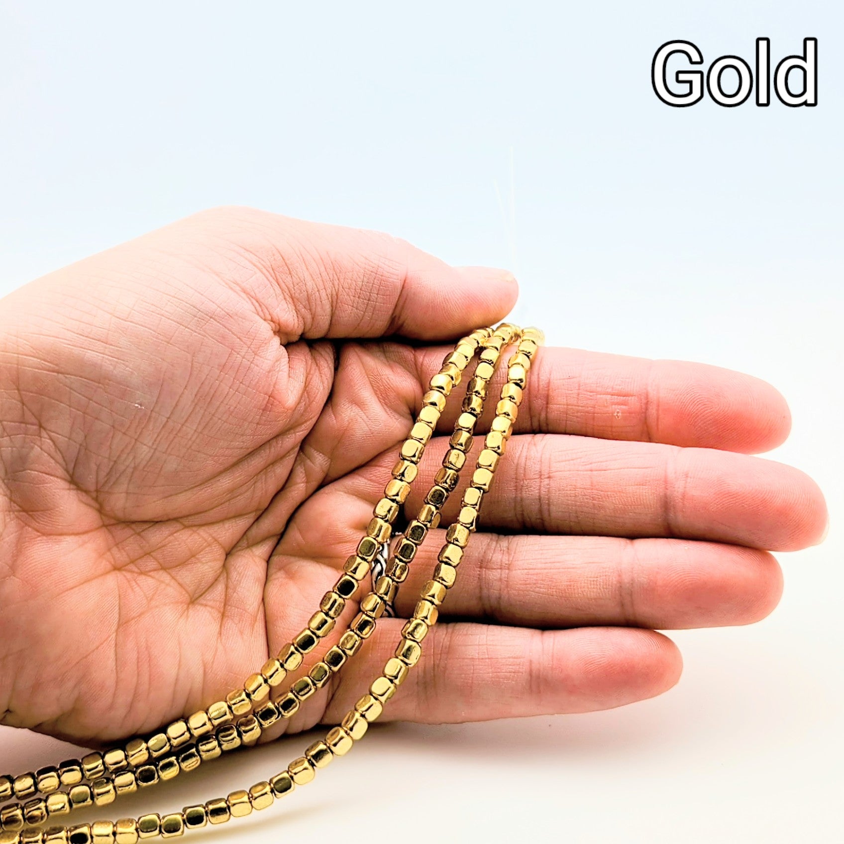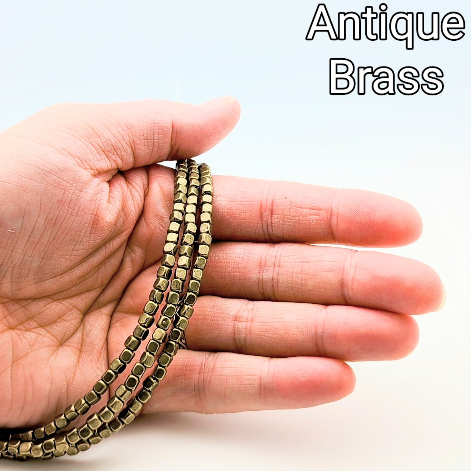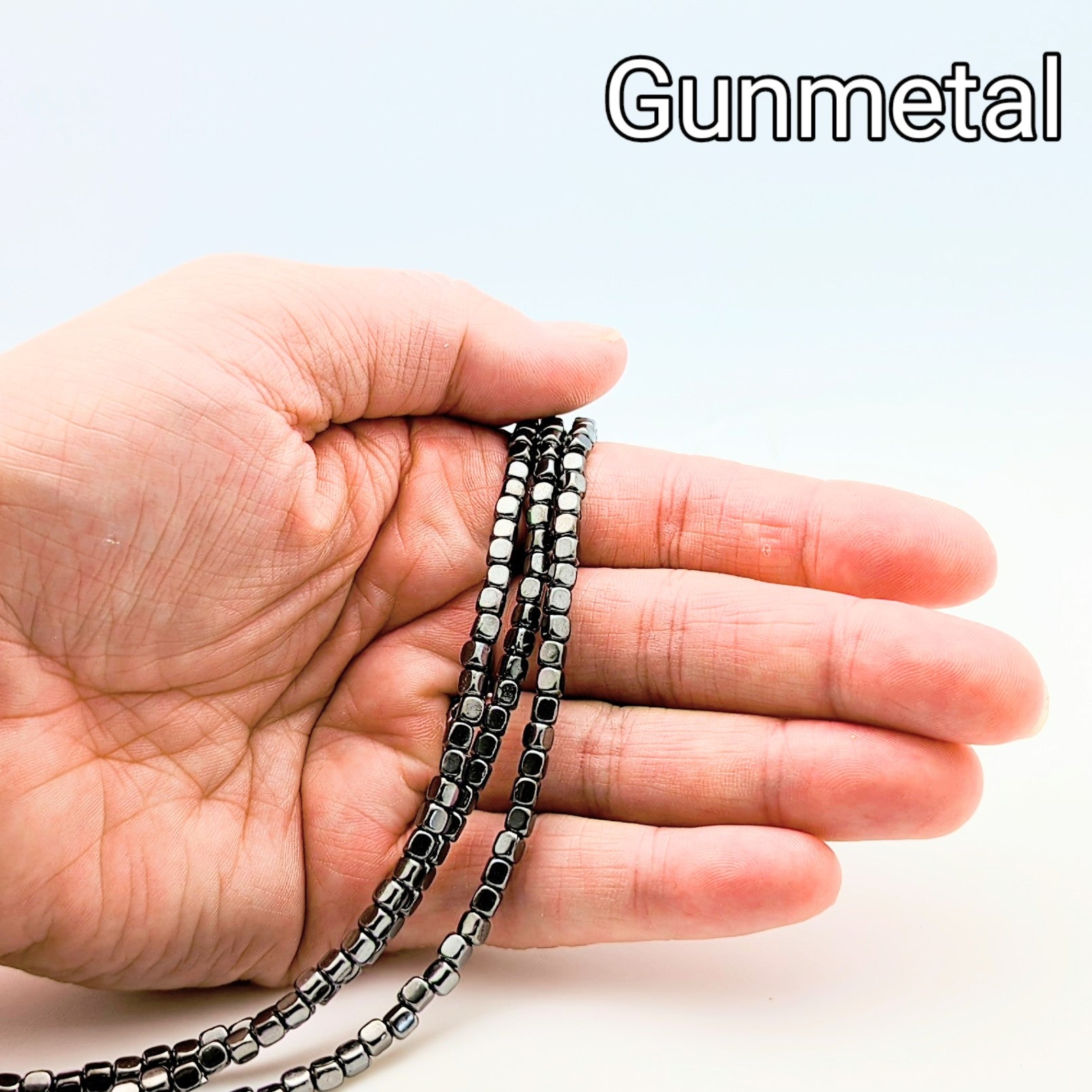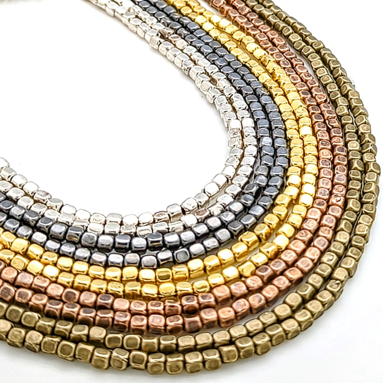 Each 14.5" strand of plated pewter soft cube beads comes in 5 different colors: Silver, Gunmetal, Gold, Antique Copper and Antique Brass. Each strand contains approximately 7 beads per inch, each measuring 3 x 4 mm.