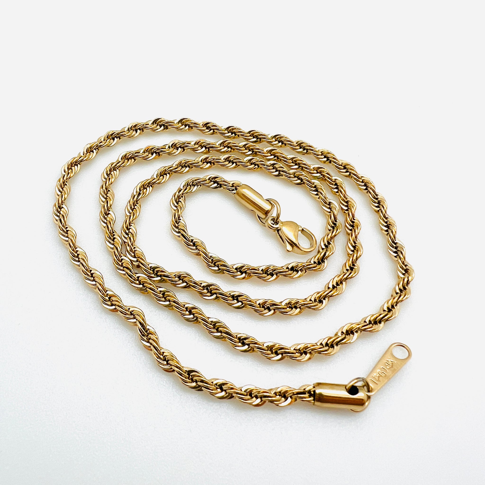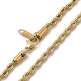 Gold plated stainless steel 3mm rope chain necklace with lobster claw clasp. This necklace is perfect for your favorite pendant.