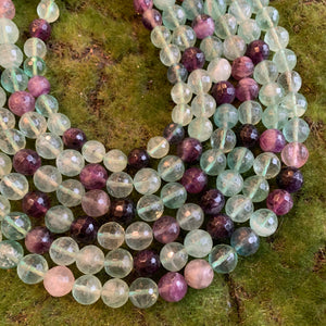 Brilliant greens and purples swirl together in these 9 and 11mm rainbow fluorite
