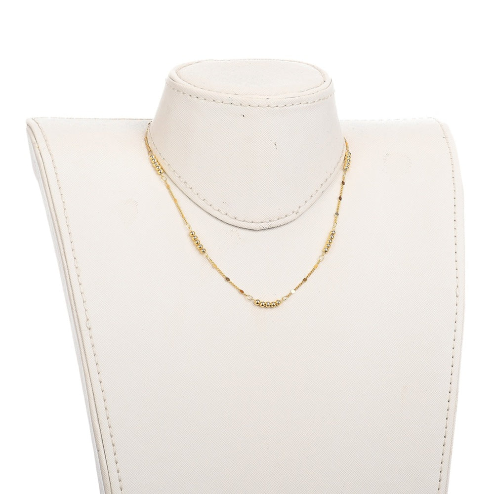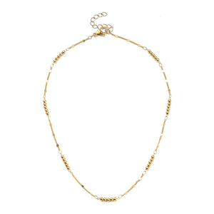 Gold plated brass round bead bar link necklace with lobster claw clasp and 2" extender. This necklace measures about 15.5" in length, adjusting to nearly 18" fully extended.