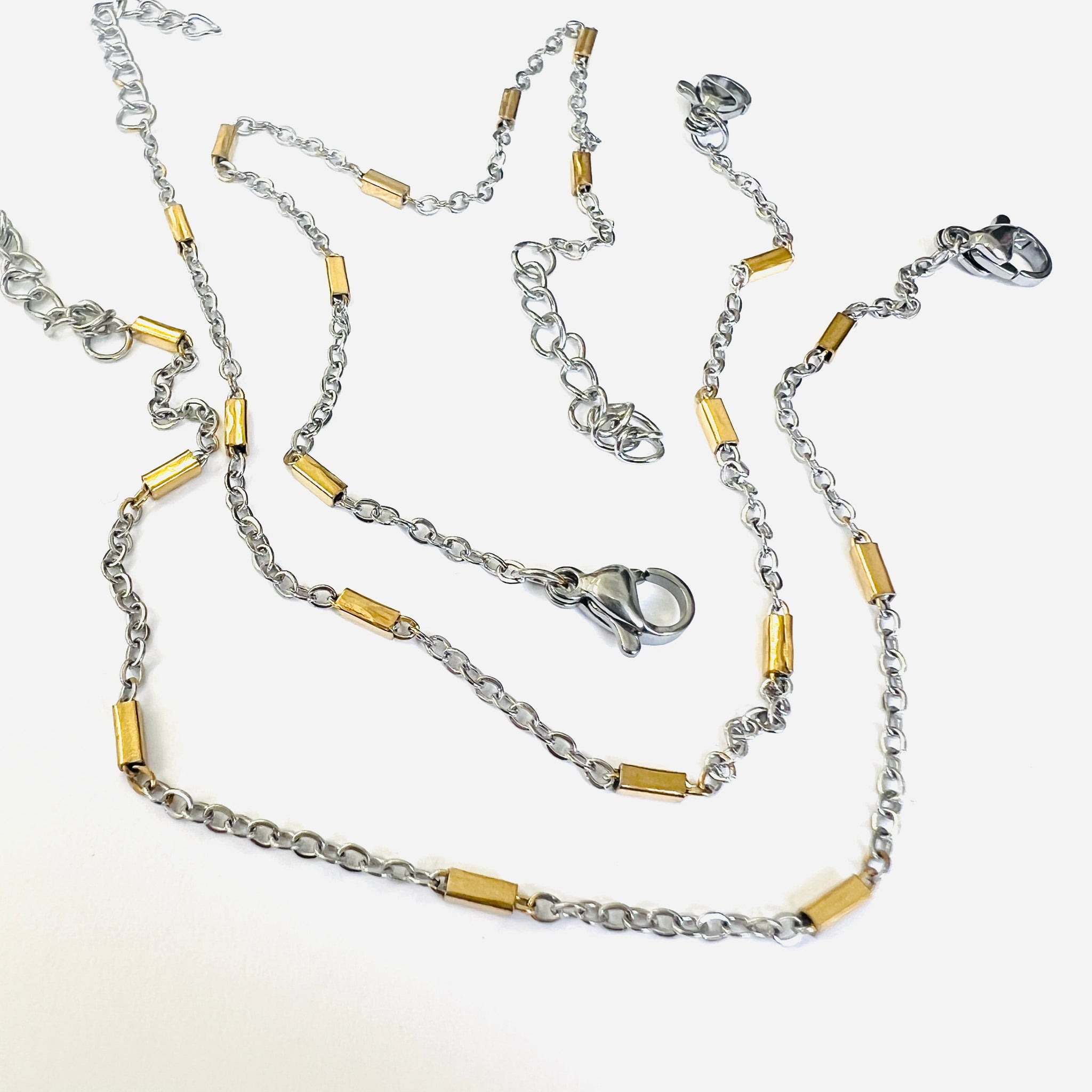 Two tone stainless steel cable chain satellite bracelet with gold plated stainless steel bar link stations, a lobster claw clasp and a chain extender.