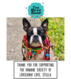 The story behind the Stella pin: Some of you may recall we had a scary life changing incident in November of 2020. Our beloved Boston terrier shop dog, Stella, was stolen in a carjacking while Georgia and her daughter were loading the car on the levee riverfront. It was an agonizing time, and right after the crime, Georgia immediately got a call from Jeff Dorson with the Humane Society of Louisiana offering a generous reward for Stella's return. It worked. After Stella's photo and story was shared all over the internet and the local news, Georgia got the wonderful call that Stella was found after being dumped in New Orleans East. Stella was soon safe and back in her family's loving arms. Nobody gets the job done like fellow animal lovers! That day, Georgia vowed to give back to the Humane Society of Louisiana, to show appreciation for how quickly they came to her aid during such a stressful time. She has been donating to them personally, but The Bead Shop knew they could do even more to give back. We had this custom lapel pin designed and created by local artist, Kevin Griffin, who then had it produced right here in the USA!