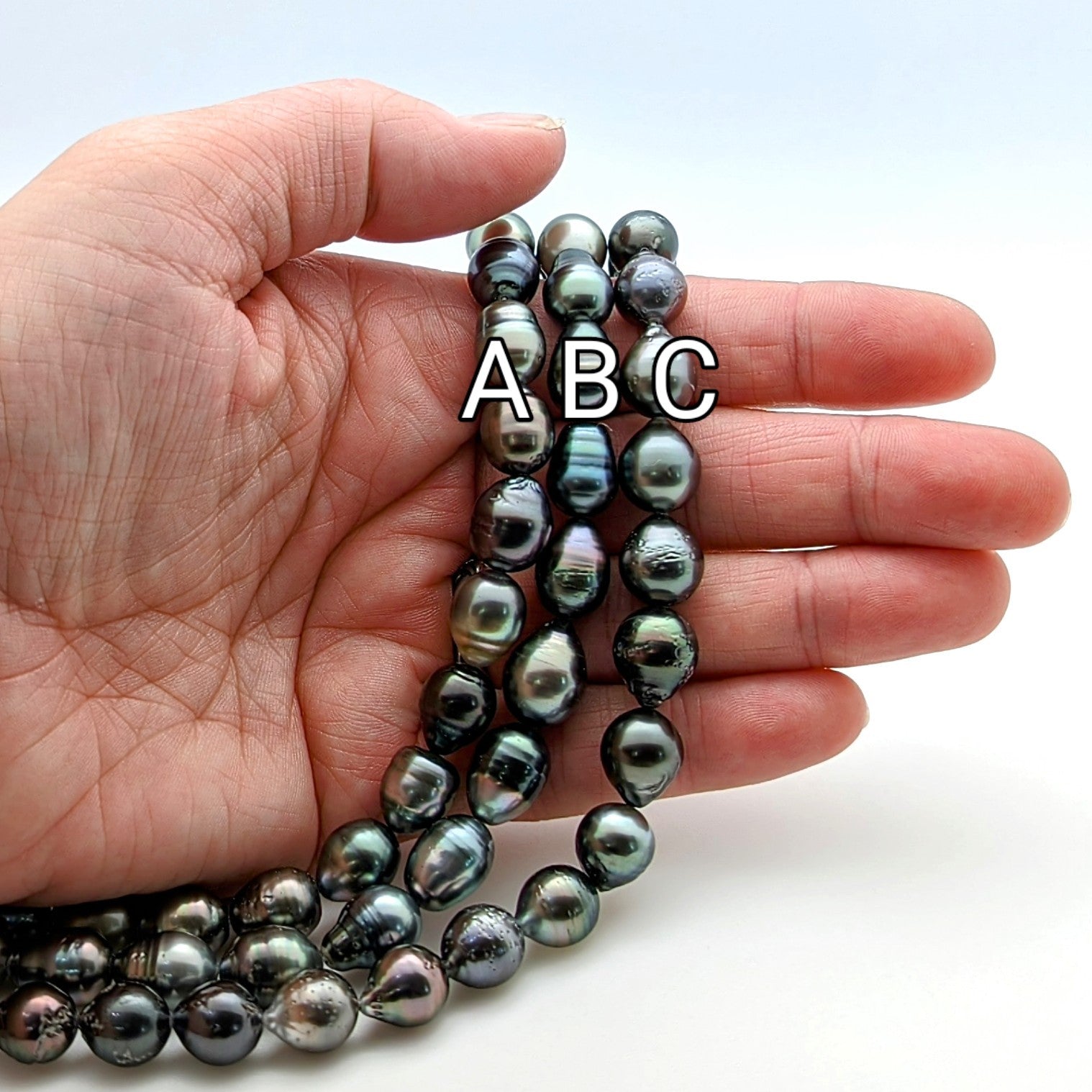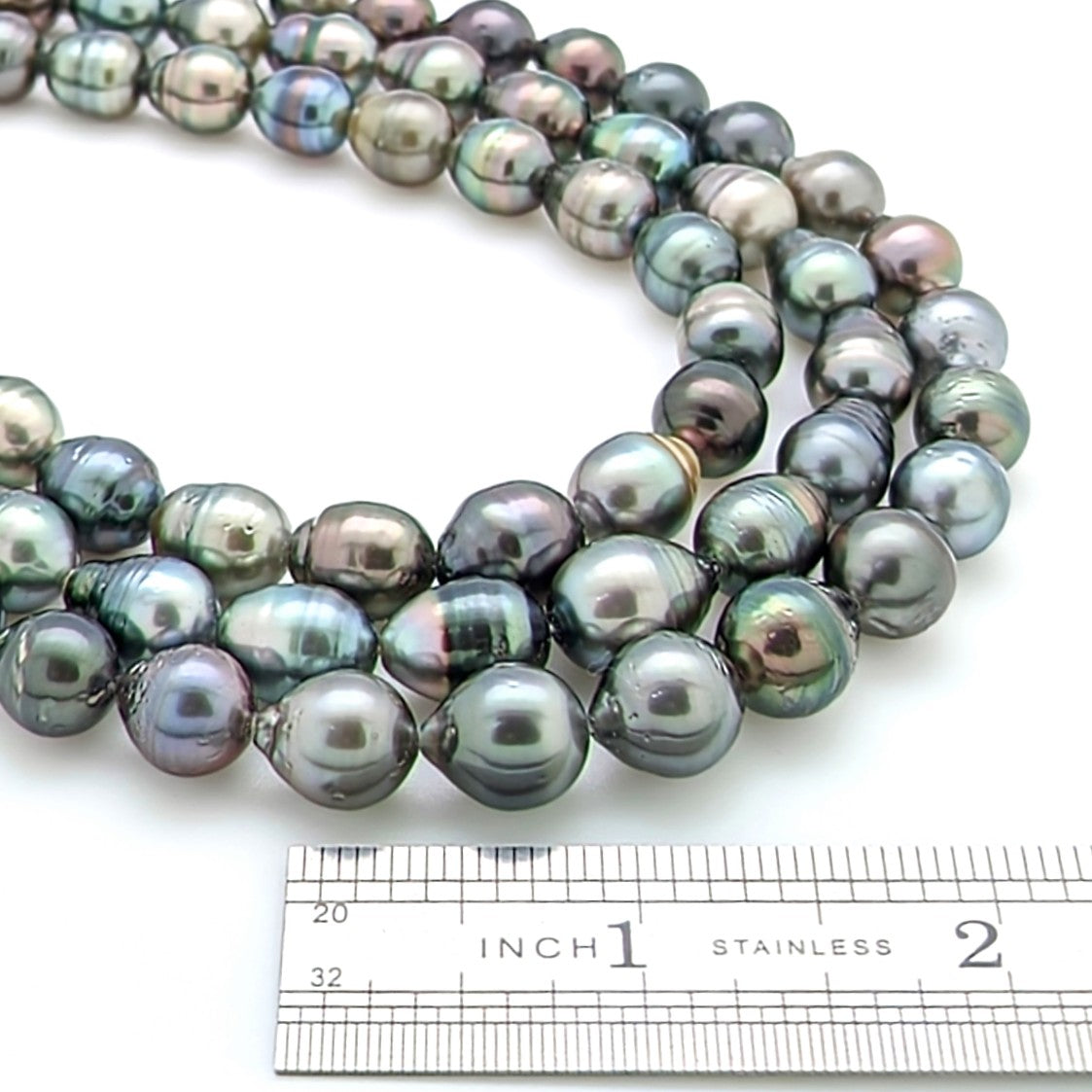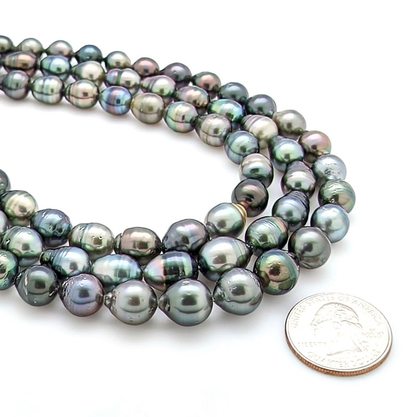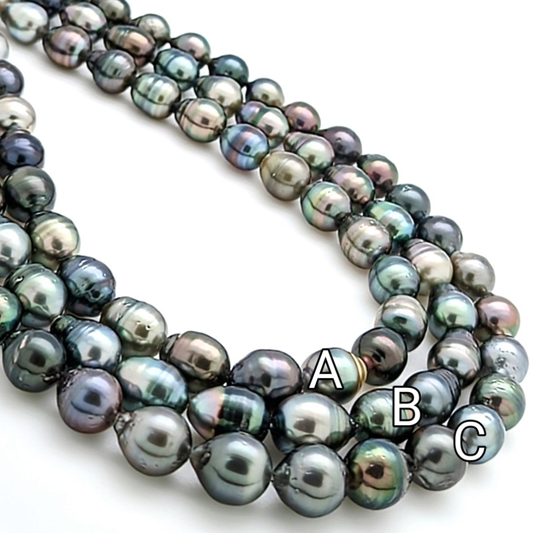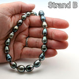 Strand A: This strand contains 36 pearls with a slight graduation from 8mm to 10mm. This strand is the lightest of the group with a nice collection of silvery-grey pearls throughout. Some pitting does occur on these pearls.