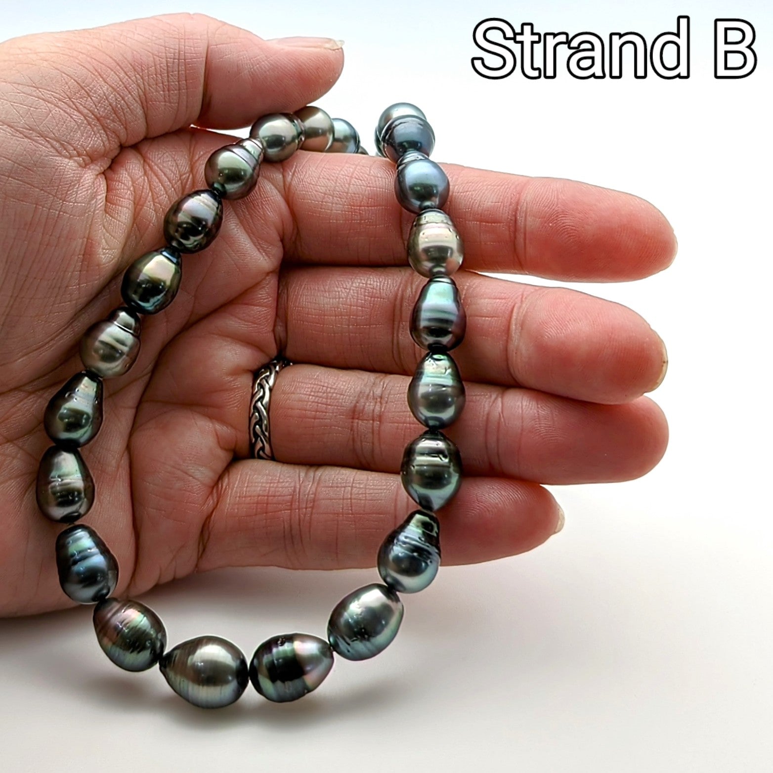 Strand B: This strand contains 33 pearls with a slight graduation from 8mm to 10mm. This strand has a few more of the larger pearls and the most variance in colors. Some pitting does occur on these pearls.
