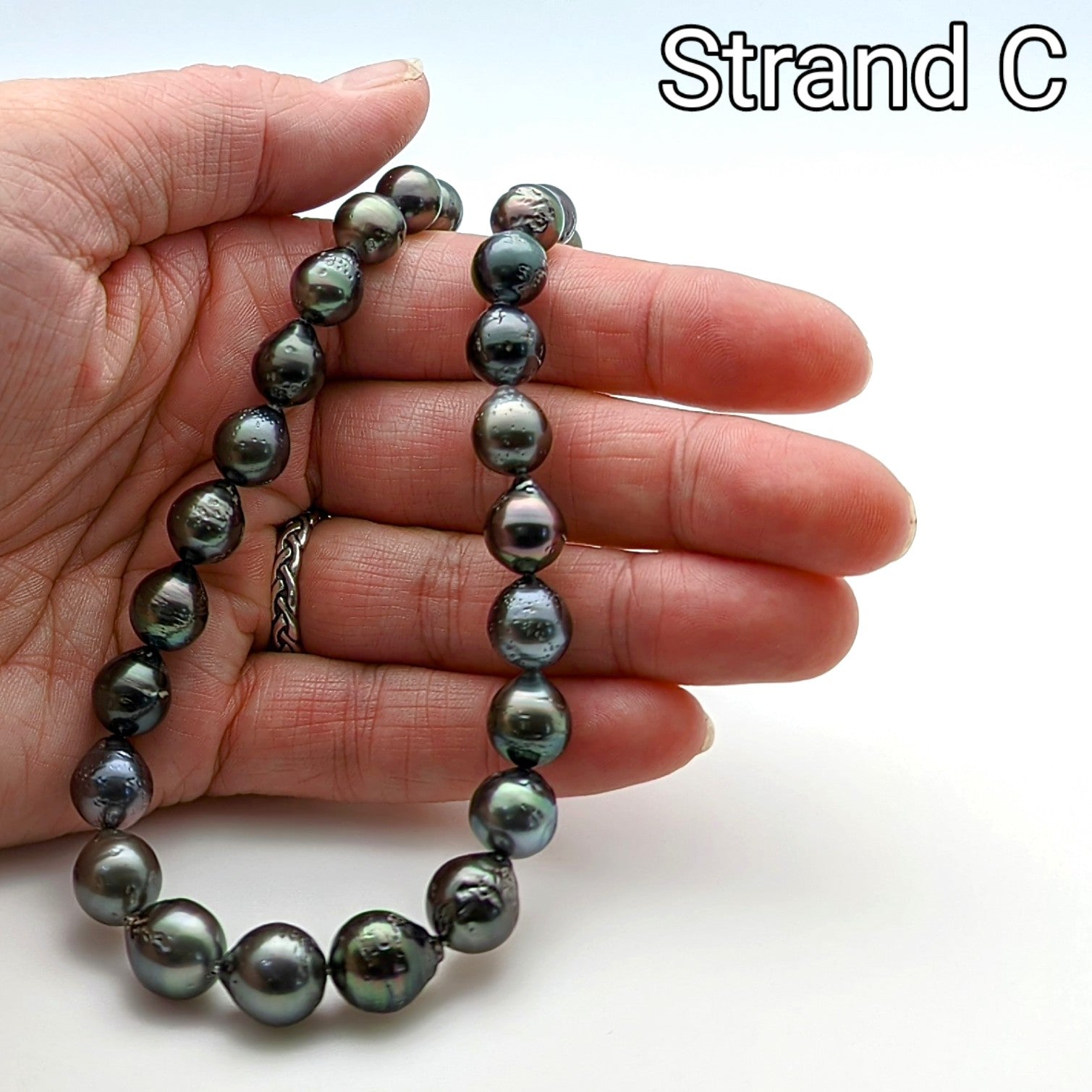 Strand C: This strand contains 37 pearls with a slight graduation from 8mm to 10mm. This strand offers the most uniform shape throughout and is the darkest of the group. Some pitting does occur on these pearls.