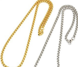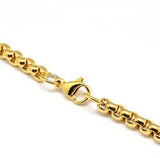 Plated stainless steel, thick and sturdy Venetian box chain necklace with lobster claw clasp.