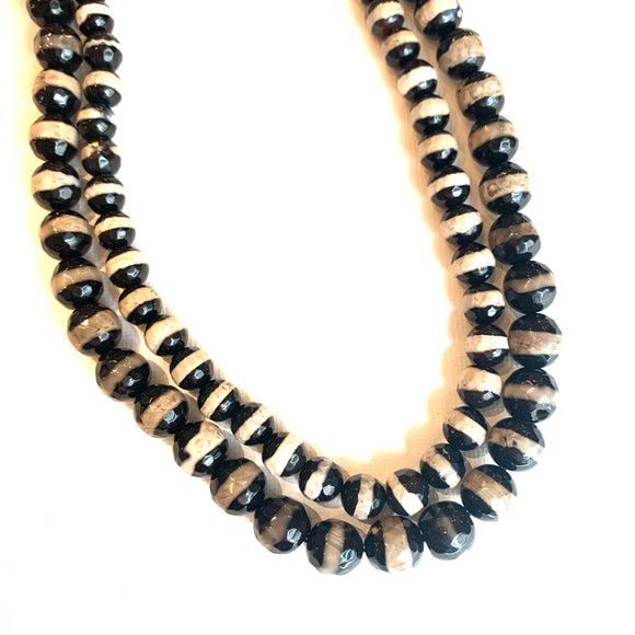 Faceted round dyed agate in Tibetan-style striped patterns.